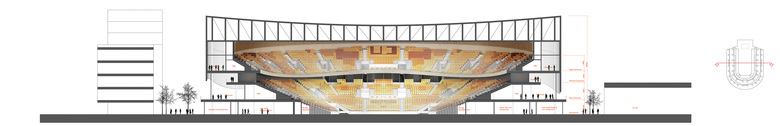 The bowl contains a variety of design features to improve performance experience, such as angled walls to improve sightlines, a flat ceiling, acoustic walls, vomitories to facilitate access and a stage set up which is first rate. With a 22 meter height around the stage, it is the focus point no matter where one isseated. The flexibility of the design allows for the widest range of events; and possible configurations that is therefore almost infinite.