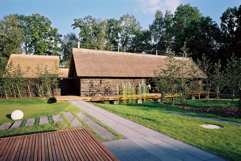 Prägendes Element der Kulturlandschaft Spreewald ist ein weit verzweigtes Netz aus Kanälen, so genannte Fließe, die zu beiden Seiten dicht mit hohen Bäumen bewachsen sind. Auch das Grundstück für die Spreewald Therme außerhalb von Burg wird durch „grüne Wände“ räumlich begrenzt. Die Bade-, Sauna- und Wellnesslandschaft greift die prägenden Elemente der Kulturlandschaft auf. Mit seinem spezifischen Erscheinungsbild bezieht sich das Gebäude ausschließlich auf den Ort Burg im Spreewald und erhält dadurch unverwechselbaren Charakter. Klare Formen und ausgewählte Materialien bestimmen die Komposition des Raumgefüges. Material- und Farbwechsel setzen besondere Akzente im Innenraum und verleihen der Therme eine warme Atmosphäre, die durch den Einsatz von Holz bei Konstruktionen und Verkleidung noch verstärkt wird. Der Bezug zum Ort wird zudem durch eine sensible Materialauswahl hergestellt. Beispielsweise unterstreicht die Verwendung von ortstypischen Materialien wie Reet, Holz und Ziegelsteinen die architektonische Verbindung der Therme mit der Region Spreewald.
