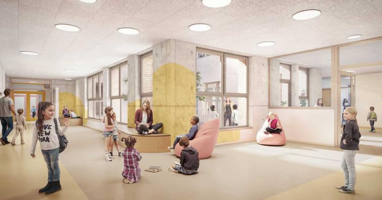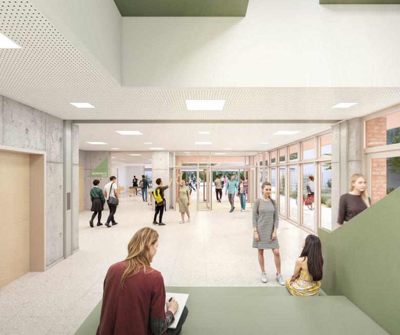 Während sich die Grundschule als geschützter Lern- und Lebensraum für die Jüngsten versteht, bietet der Erweiterungsneubau der Katharina-Henoth-Gesamtschule ein offenes, urbanes Lernumfeld für die 9. Klassen der Gesamtschule. Die Sporthalle mit Zweifeldhalle und die Wohnungen für die Hausmeisterei ergänzen den Campus zu einem zukunftsfähigen Schulstandort. So entsteht ein vielfältig genutzter Bildungsstandort, der Austausch ermöglicht, ohne die Eigenständigkeit der Schulen aufzugeben.