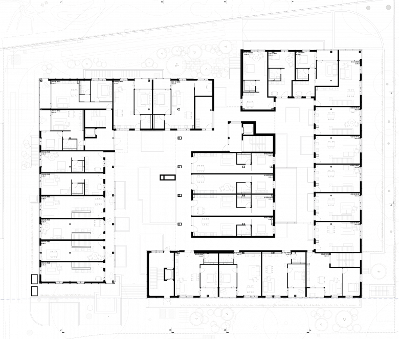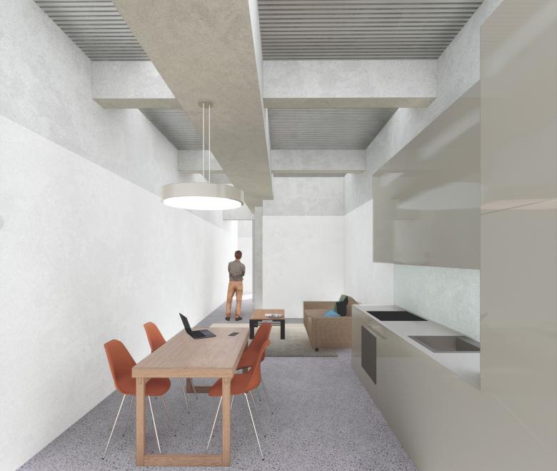 Das neue Wohnungsangebot hebt sich von den Familienwohnungen in der Umgebung ab, wodurch die Durchmischung des Quartiers gefördert wird. Die besonderen räumlichen Bedingungen der bestehenden Gebäudestruktur verlangen nach aussergewöhnlichen Wohnungstypologien. Viele der Wohnungen werden direkt von den beiden Innenhöfen erschlossen. Die grossen Raumhöhen ermöglichen trotz hoher Dichte grosszügig angelegten Wohnraum.
