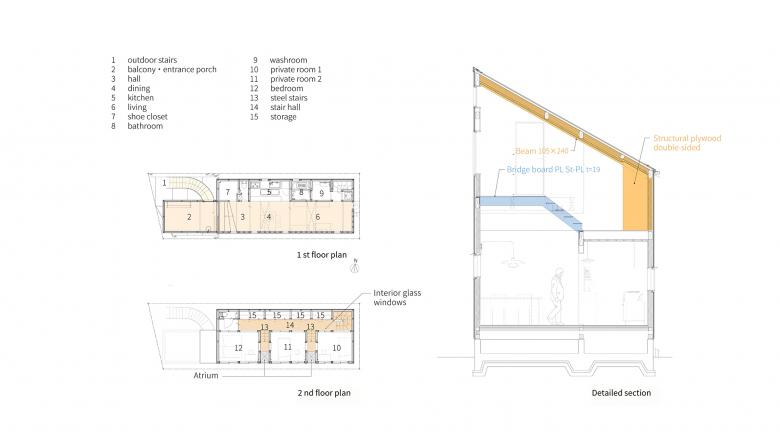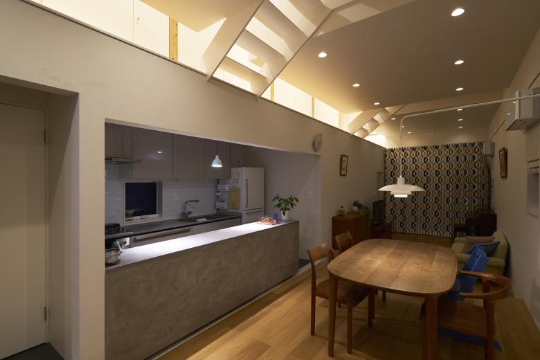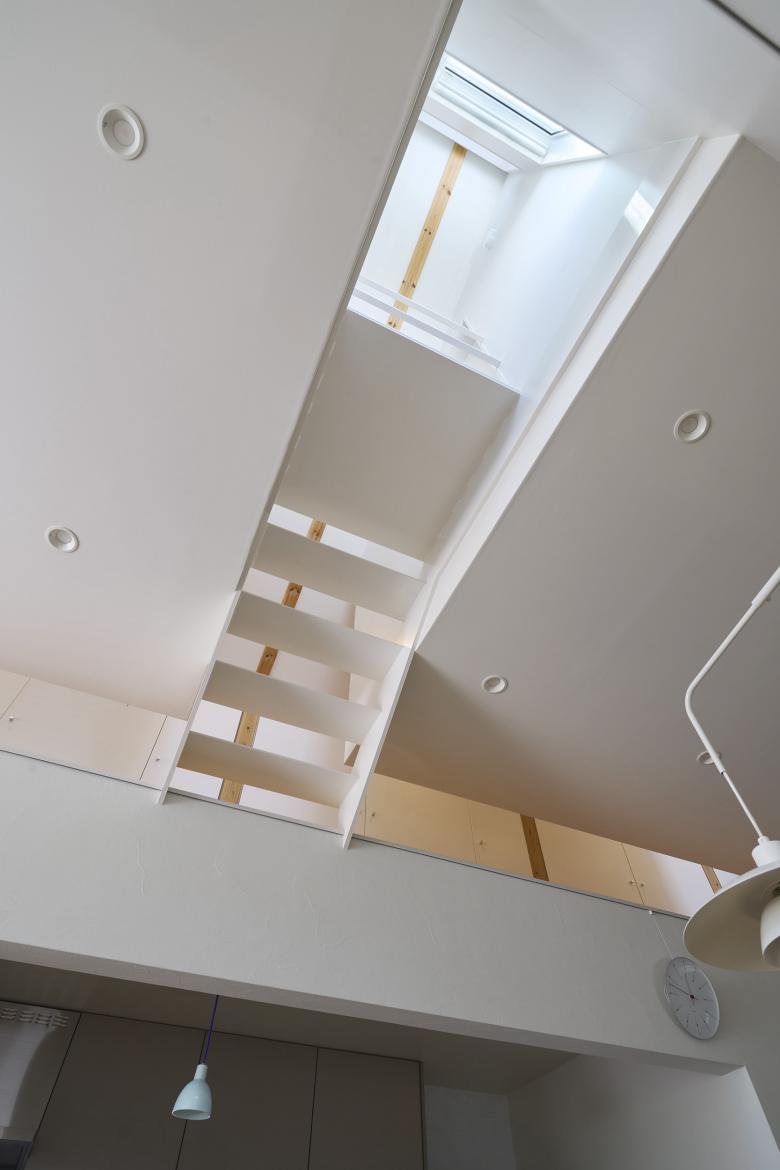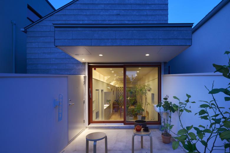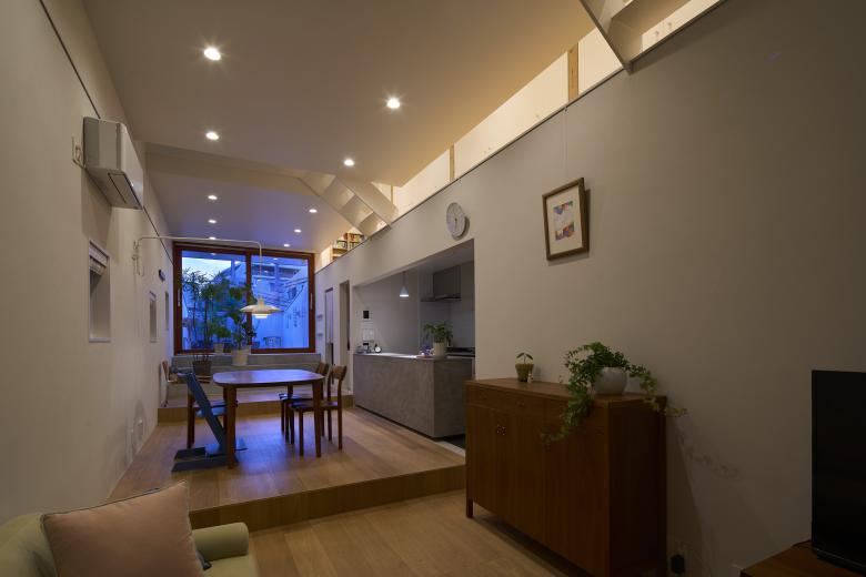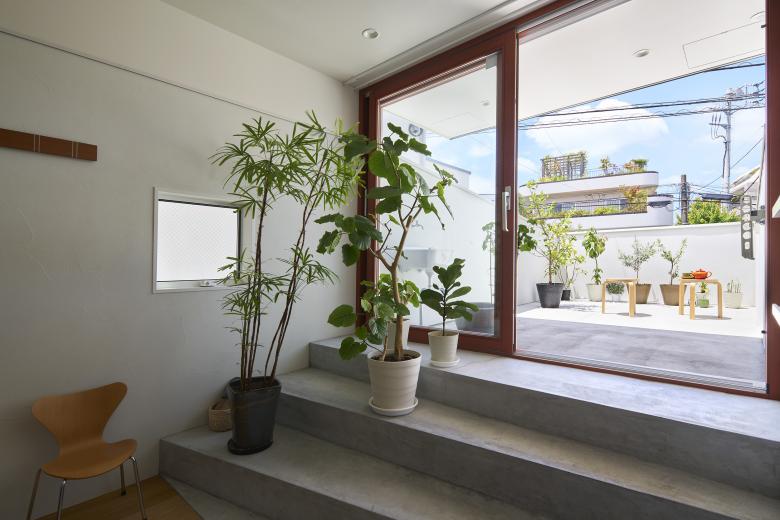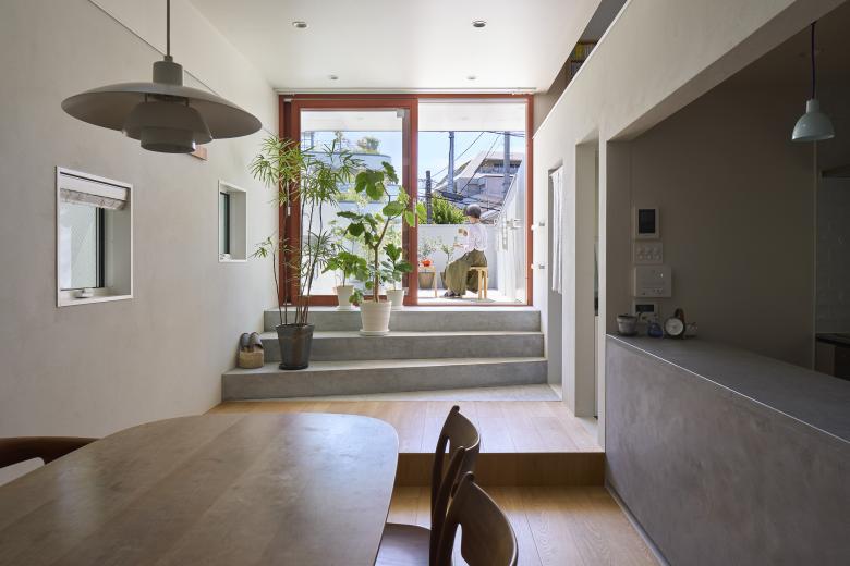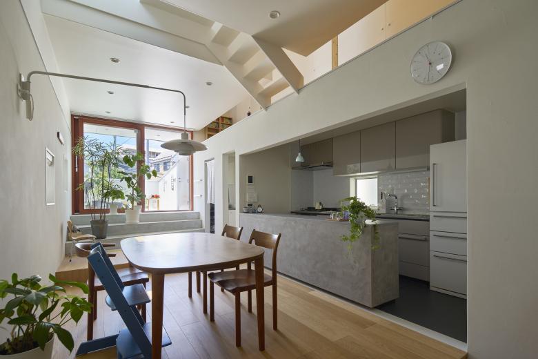 The first floor is flanked by neighboring houses on both sides, but the second floor receives plenty of sunlight through the roof of the neighboring house, and from there, soft light reaches the first floor through the atrium. If you open the window, the wind will pass from the first floor to the second floor. In order to enhance the openness of the space, the visible pillars supporting the second floor were removed and replaced with a structure supported by steel-framed stairs.