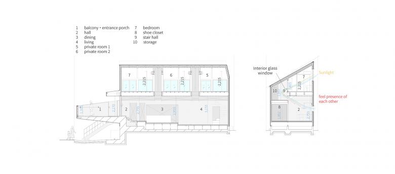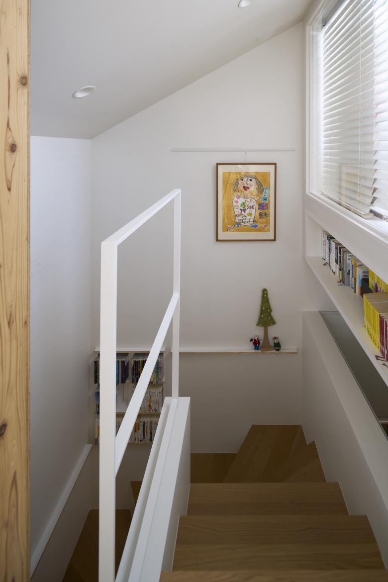 The first and second floors are connected through open staircase with bookshelves and storage which cuts off the scene diagonally. The entire house is connected by skip floors, allowing the four members of the family to feel each other’s presence, and at the same time, the interior glass windows in the private rooms on the second floor can be opened and closed to adjust the comfort level.