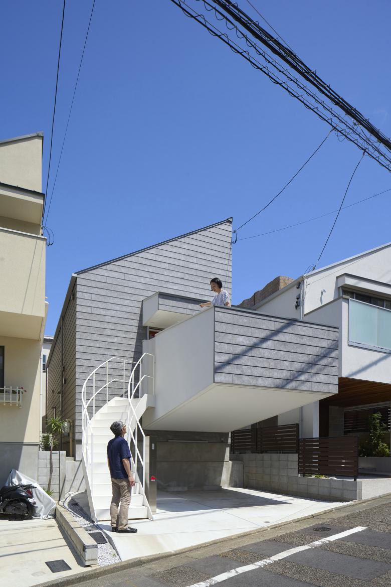 The balcony is protruded toward the front road, creating a garden-like space in the air.