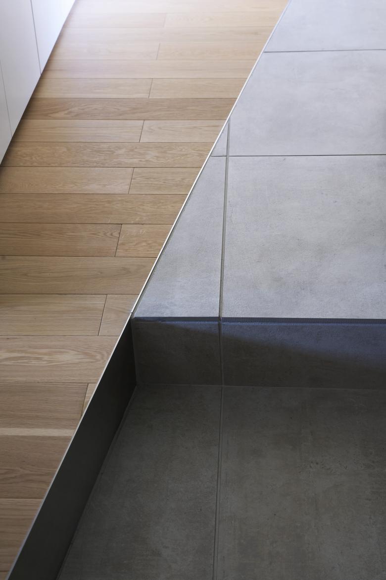 The wood flooring is chosen for living/ dining room and bedroom for barefoot comfort, and the walls and ceilings are mostly white to give neutral finish. The “Shores” floors are either tiles or carpet depending on its function, and the walls and ceiling are finished in two colors. One is a red brown sampled from the surrounding environment seen outside the railroad side of the window, and the other is a moss green sampled from a café run by the client that is within one-minute access from the door of the apartment.