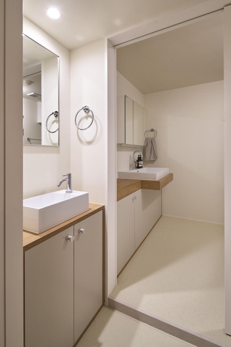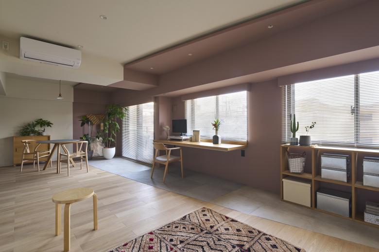 While the advantage of the client’s apartment is a wide frontage with many windows, initial layout made it impossible to fully enjoy the light and wide view due to the space being segmented by too many rooms. We decided to remove the walls to intake the light and view in an open space where the wind could pass through the windows. The bathroom was placed in the center of the apartment as detached room, and the bedroom can be closed with movable partitions to secure privacy.