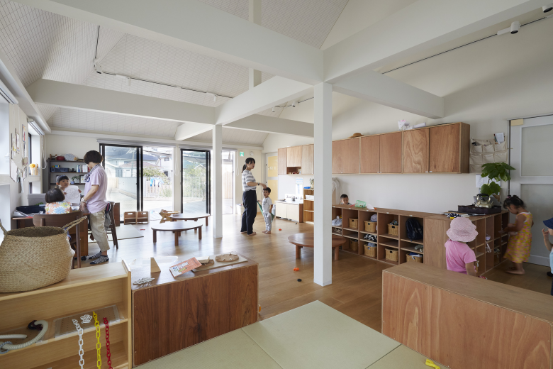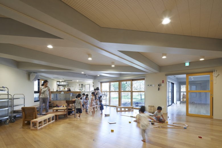 Determinant element in design conception was participation of Mr. Makoto Aoyama as the principal of this day care center, who was invited by a board chairperson of Tokokai, a social welfare corporation, Mr. Koryo Saito, the owner of this project. Mr. Aoyama has been an active practitioner of child care in various fields, such as speaker at seminars, event planning, writing essays while working as nursery staff at a non-registered day-care facility in Yokohama. His belief that “day care centers are essentially not necessary for taking care of children as children have potential to grow on their own. Day care centers are required as there is no place in a community for children to get together and learn on their own” led us to reconsider raison d’etre of day care center. Our response to the objective of this day care center was to offer a place where “community raises children”.
