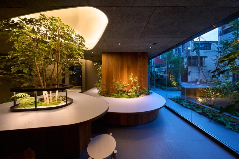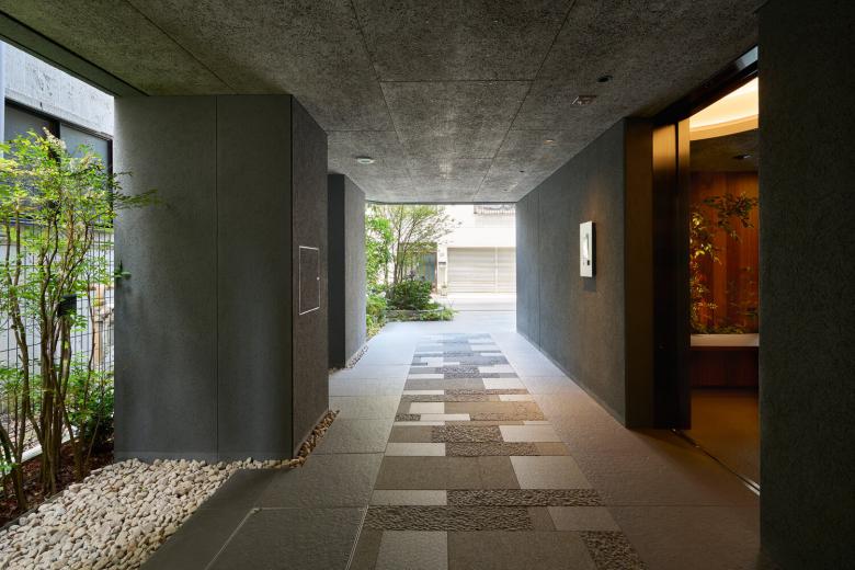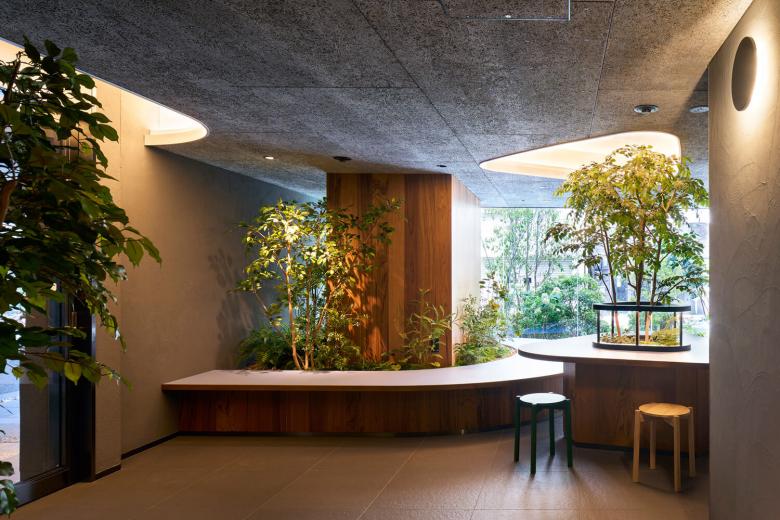また、本計画では単に物理的な外観の整備だけでなく、「共生の風景」を建築に内包することを目指した。1階には街に開かれた前面の緑化空間と、住人誰もが自由に滞在できる共用ラウンジを設けている。ラウンジは仕事や読書、軽い打ち合わせや一息つく休憩など、目的を限定せず多様な使い方を許容する場である。その日の気分や過ごし方に応じて自ら距離感を選べる構成となっており、偶発的な視線の交差や軽い挨拶をきっかけとした小さな共感が生まれる。過度に開かれすぎず、かといって閉ざされることもない、現代の都市生活者が求める「にじむような関係性」を宿す空間である。周辺に緑の少ない立地であることにも配慮し、前面の緑化空間はポケットパークとして街に開かれ、地域住民の憩いの場としての役割も担う。