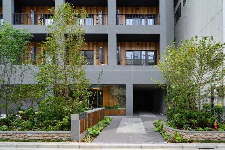 一般的な都市型マンションにおいては、ファサードがバルコニーによって支配され、空調室外機や給湯器などの設備機器、日用品が露出することによって生活感が表出し、都市に雑然とした印象を与えてしまうことが多い。またそのスケールは建物内部の小さな住戸単位に呼応しがちで、周囲の街並みに対する調和が難しいという課題がある。こうした背景を踏まえ、本計画では生活感をにじませすぎず、かつ閉鎖的にならないよう、開口部のサイズと配置、外装の色彩、建物全体のプロポーションの調整を通じて、落ち着きと秩序ある都市的な佇まいを追求している。バルコニーの手摺には縦格子を採用し、外からの視線を適度に遮りつつ、風や光を通し、内部の開放感を保つ設計とした。