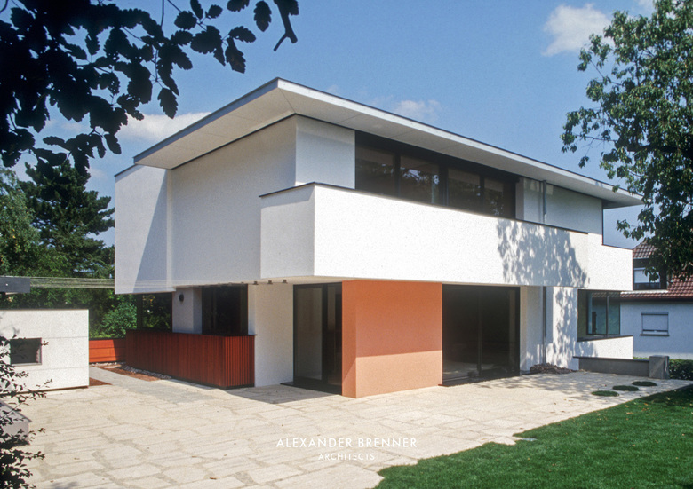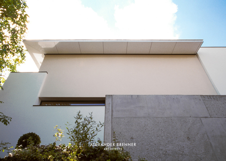 Das Haus liegt am Ende der Straße, wo diese in einen Fußweg übergeht. Durch die Anlage der Garagenzufahrt entstand hier eine platzartige Aufweitung des Straßenraums, die durch das Herausrücken des Baukörpers aus der Bauflucht noch akzentuiert wird. Eine weitere Betonung erfährt diese Nahtstelle durch die vortretende, winkelförmige Wandscheibe an der Nordostecke des Gebäudes.