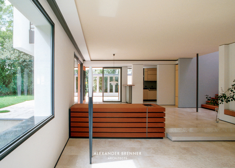 Die holzverkleidete Wand des Sockelgeschosses, in dem auch die Garage integriert ist, leitet den Ankommenden zum Grundstückszugang. Von hier aus gelangt man über eine Treppe zum Eingang auf der Wohnebene. Auf dieser Ebene sind in einem offenen Raum auch der Essbereich und die Küche. Ebenso wie im Obergeschoss öffnen sich hier die Räume über große Glasflächen nach Süden und Westen zum Garten.