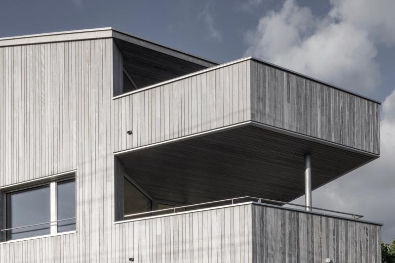 Im Innern offenbart sich das Herzstück des Gebäudes. Die aus massiver Eiche konstruierte Holztreppe, welche nur ein paar Tagen vor dem Bezug der Wohnungen aufgerichtet wurde, windet sich wie eine Spirale in die Höhe und verbindet die drei Geschosswohnungen inkl. Keller miteinander.