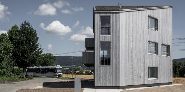 Der Ersatzneubau wurde als vorfabrizierter Holzelementbau konzipiert. In nur gerade einer Woche wurde das stattliche Gebäude aufgerichtet. Die sehr kurze Bauzeit ermöglichte uns den Verzicht von aufwendigen Sicherungsmassnahmen entlang der Bahngeleise.