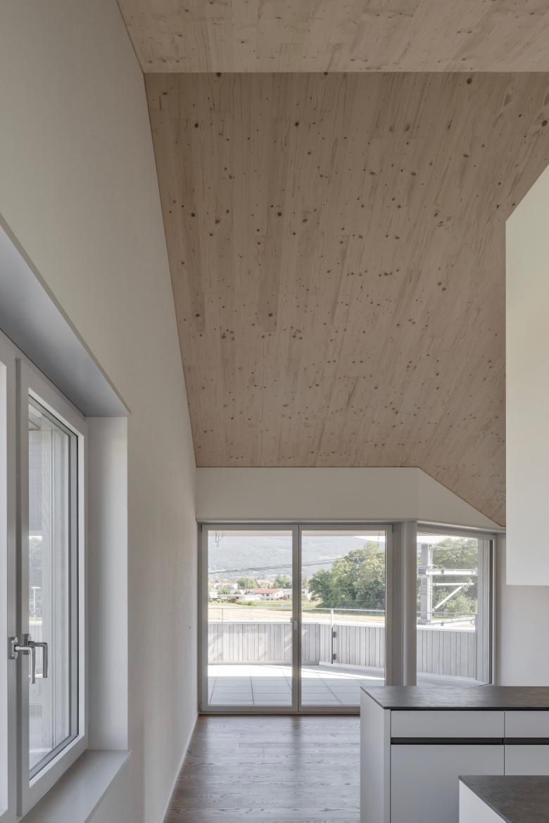 Ausschlaggebend von der Gesetzgebung entwickelten wir einen Grundriss, der sich den Grundstückgrenzen entsprechend in einer Dreieckform organisiert. Auch im Schnitt wurde der Umriss des Volumens durch die gesetzlichen Höhen definiert was wiederum Auswirkungen auf die Anordnung der Räumlichkeiten im Grundriss hatte. So wurden die Räume mit reduzierten Raumhöhen wie Treppenhaus und Dachterrasse an die Aussenseiten des Volumens platziert.