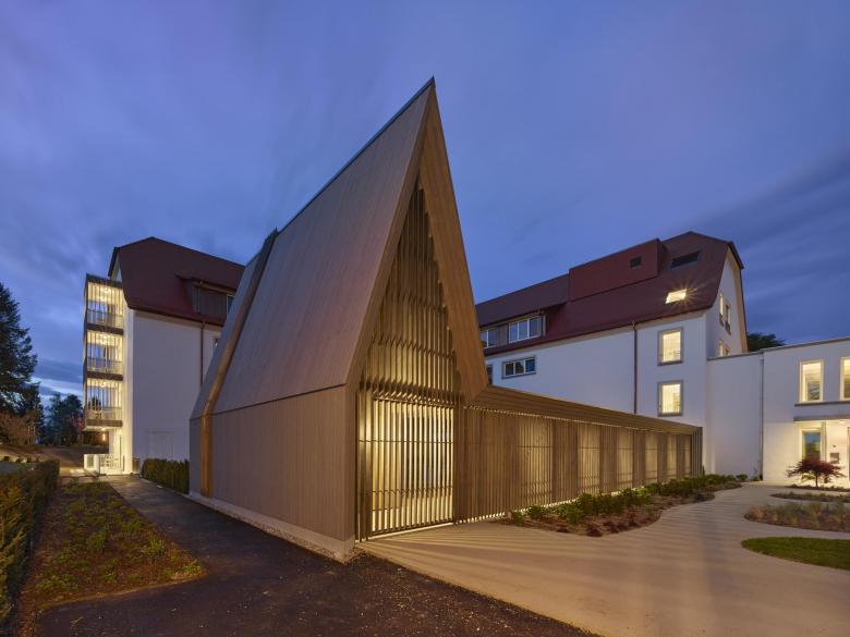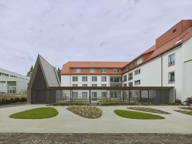 Die Kapelle mit Verbindungsgang bildet mit dem Winkelbau des neuen Pflege-heims einen Hof. Zum einen ein tradiertes Element in der Klosterarchitektur zum anderen ein wichtiger, geschützter Freibereich für die Bewohnerinnen des neuen Pflegeheims.