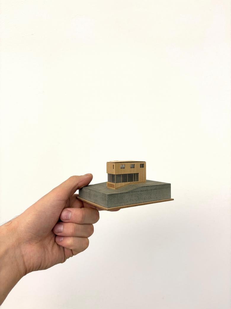 Die Bauherren – ein Ehepaar mit zwei Kindern – erhielten die Möglichkeit, auf dem Grundstück der Eltern der Bauherrin ein Einfamilienhaus zu realisieren. Der Standort wurde so gewählt, dass eine spätere Entwicklung des übrigen Landes nicht eingeschränkt wird. Die Wahl fiel auf eine schmale Zone zwischen dem Elternhaus und der westlichen Parzellengrenze. Das geneigte Gelände, die Nähe zum bestehenden Wohnhaus und die Aussicht über die weite Wiese prägten das Konzept. Da keine räumliche Distanz zum Nachbarhaus möglich war, entstand die Idee, durch klare Form und Materialität eine eigene Identität zu schaffen. Der Baukörper präsentiert sich als präziser, hölzerner Kubus, der sich durch seine markante Erscheinung bewusst von der Umgebung absetzt.
