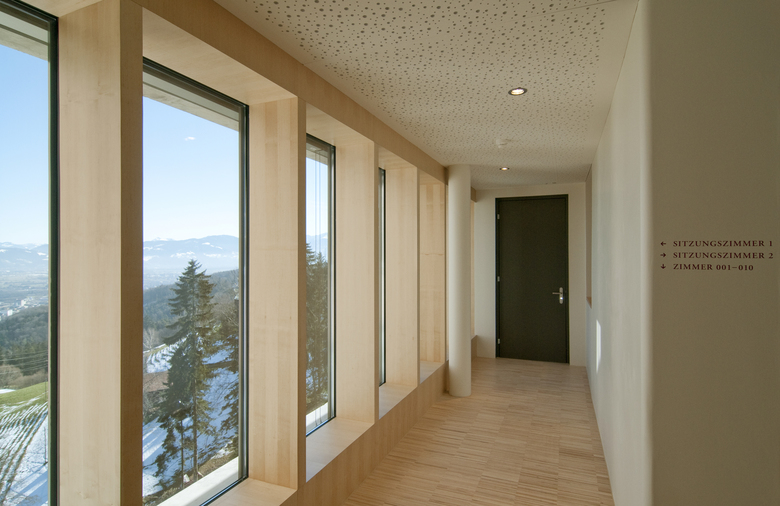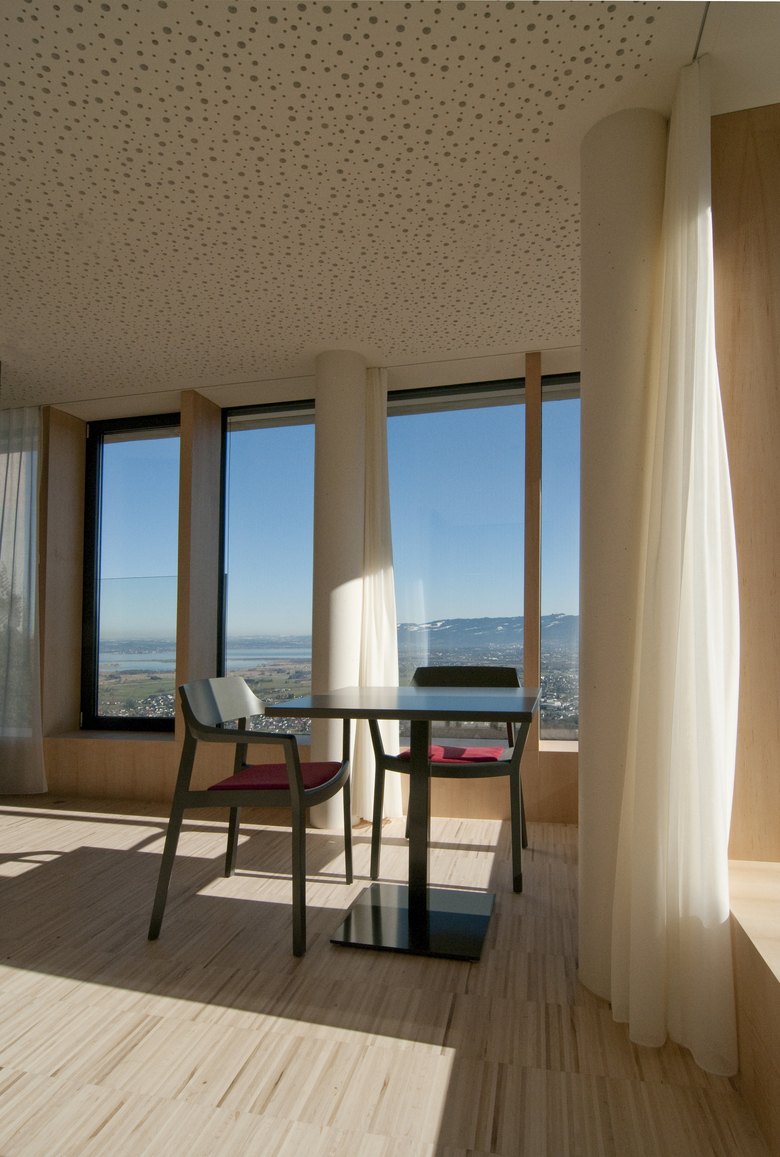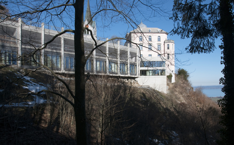 Für die private neurologische und orthopädische Rehabilitationsklinik wurde ein bestehendes Parkdeck zu einer neuen Bettenstation mit hellen Patientenzimmern und Sicht auf den Bodensee umgebaut. Zusätzlich entstand ein moderner Verbindungsbau aus Sichtbeton und Glas mit Erschliessung, Besprechungsräumen und Patientenzimmer. Für die immer schwerer beeinträchtigten Patienten wurden der Plege und Therapie angepasste Raumverhältnisse geschaffen.