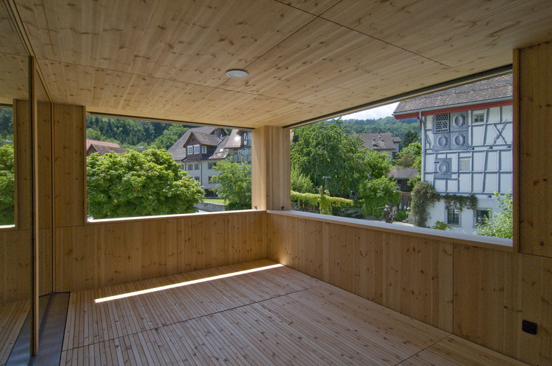 Die Loggia mit Süd- und Westöffnung ist komplett in Holz ausgekleidet und bietet erfrischenden Ausblick auf die historischen Häuser des Dorfkerns. Modern, energieeffizient Wohnen im historischen Dorfkern spricht junge, kostenbewusste Menschen an. Die Wohnungen, welche problemlos als Stockwerkeigentums-Einheiten verkauft werden könnten, fanden schon im Rohbau Mieter. Ausschlaggebend für diesen Erfolg waren bestimmt die flexibel nutzbaren Grundrisse, die sichtbare Energieeffizienz und die sorgfältige Materialwahl. Nachhaltigkeit hat viele Gesichter, und kann, bei gekonntem Einsatz auch ein bisschen süchtig machen. Schliesslich war es ein hinreissender Vortrag von Bertrand Piccard, welcher in den Ohren der Bauherrschaft bei wegweisenden Entscheiden immer wieder nachhallte; oder in Piccards Worten ausgedrückt: „Der Umweltschutz wird sein Ziel nur dann erreichen, wenn die Massnahmen bezahlbar sind und weder Mobilität noch Komfort begrenzen.“