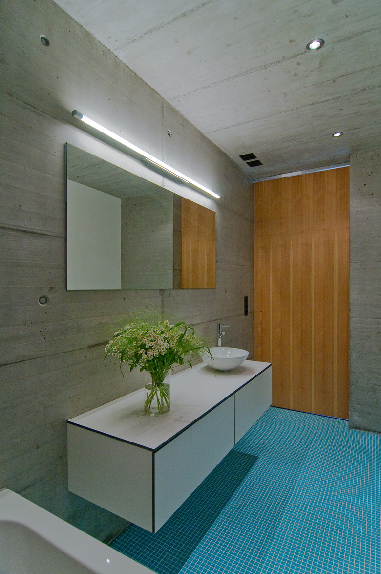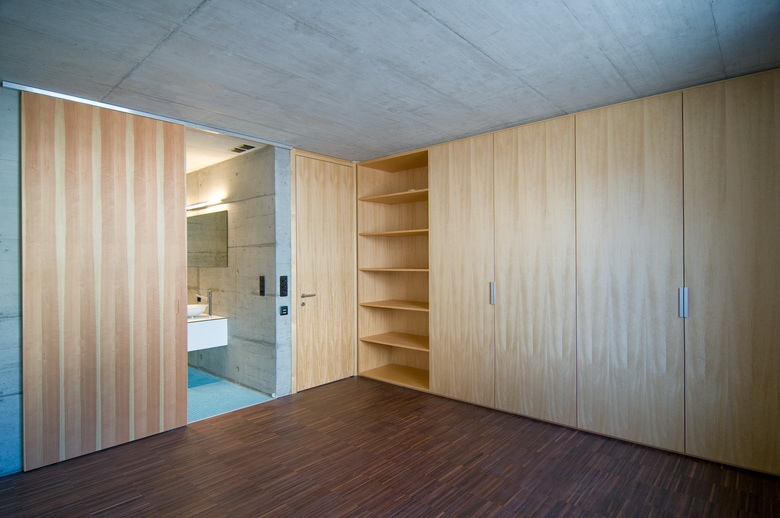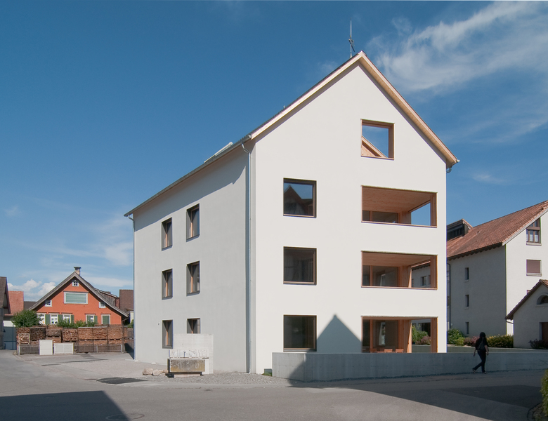 Entstanden ist eines der wenigen Minergie-P Mehrfamilienhäuser im St. Galler Rheintal. Der Neubau gliedert sich selbstsicher ins geschützte Ortsbild der schmucken Weinbaugemeinde. Raffinierte Detaillösungen innen und aussen lassen Besucher wie Passanten staunen und schmunzeln. Der Baukörper mit dem unregelmässigen fünfeckigen Grundriss passt sich der Parzelle an und übernimmt die ortsbaulichen Strassenfluchten. Konsequente Materialienreduktion und sich wiederholende Fensterformen verleihen dem ungewohnten Bau dennoch eine zurückhaltende Eleganz. Jedes Stockwerk bietet offenen, frei einteilbaren Wohnraum. Im Zentrum finden sich die Infrastrukturräume wie Bäder, mit durchgehenden Duschanlagen, Technikraum mit eigener Waschmaschine und Komfortlüftung. Die Sichtbetonwände und –decken harmonieren wunderbar mit dem offenporigen Akazienparkett und den seidenglänzenden Fensterrahmen, Türen und Schrankausbauten in Gebirgsföhre. Eine grosszügige Küchenzeile mit rollbarem Arbeitskorpus bildet den Schwerpunkt dieses modernen Wohnens.