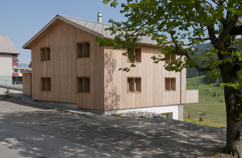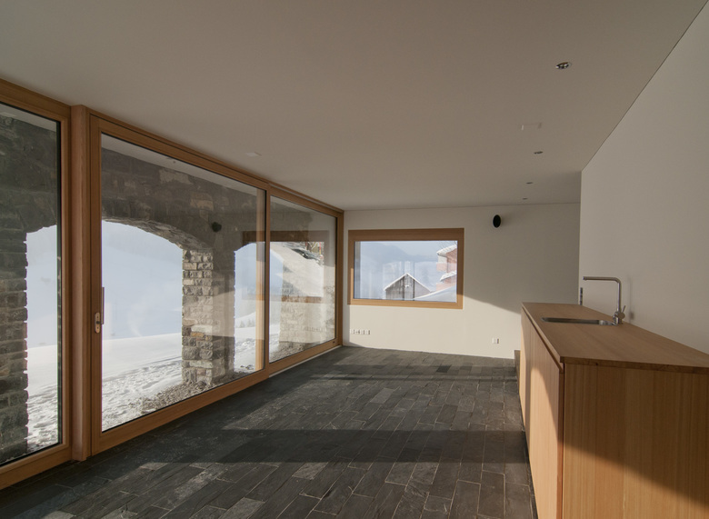 Für die stark in Mitleidenschaft gezogen Bausubstanz blieb nur eine Totalrenovation. Es entstand eine grosszügige Wohnung über drei Geschosse mit einmaliger Aussicht auf die Churfirsten. Das Gebäude hat neu eine unbehandelte Lärchenfassade mit Lärchenfenstern. Die Balkone nach Süden wurden auf einen frei auskragenden Balkon reduziert, so dass sich das Gebäude nun wieder besser in die schöne Berglandschaft einfügt.