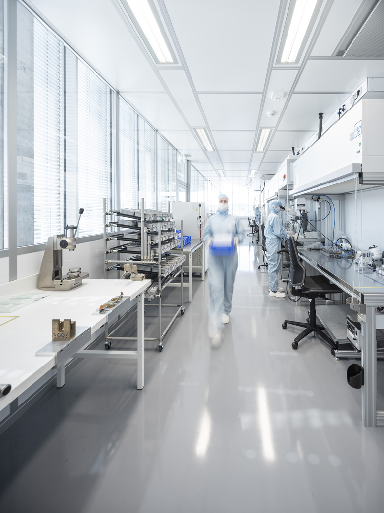 Im Hinblick auf mögliche Umnutzungen ist die gesamte Gebäudekonstruktion flexibel gestaltet. Während in den unteren beiden Geschossen das Stützenmaß bei 7,50 m x 7,50 m liegt, bilden im dritten Geschoss horizontale Betonfertigteilträger mit einer Länge von 22,5 m das Dachgerüst und sorgen für komplett stützenfreie Hallenschiffe. Hier befinden sich die Produktionsbereiche und Reinräume, die sich in einem Box-in-der-Box-Prinzip entlang der Fassade anordnen, wodurch sie über eine natürliche Belichtung verfügen und den Mitarbeitern Ausblicke ins Grüne gewähren. Zwischen der Fassade und den Reinräumen verläuft der Besuchergang, der Einblicke in die Arbeitsbereiche gewähren soll.