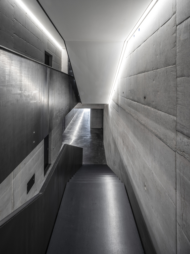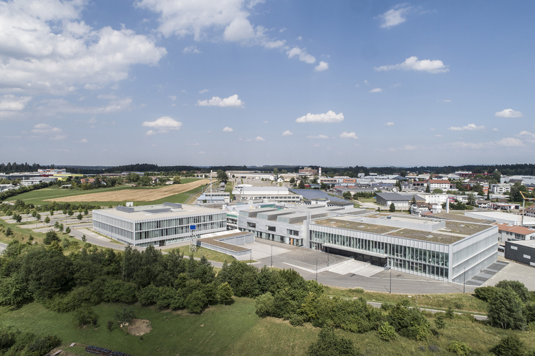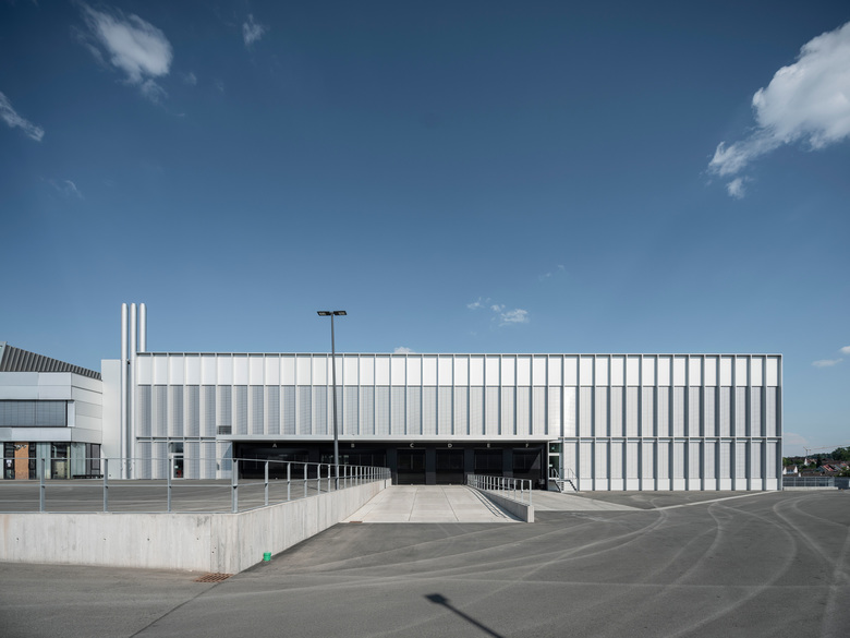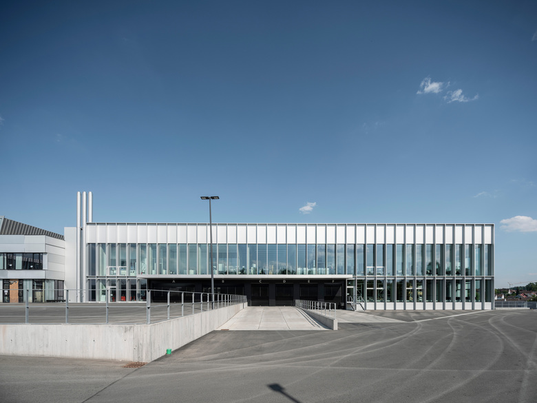 Das neue Produktionsgebäude für Festkörperlaser schließt unmittelbar an den bereits existierenden Forschungsbau auf dem Schramberger Firmencampus von Trumpf an. Erscheinungsbild und Materialität führen die Sprache des bestehenden Entwicklungszentrums für Lasertechnik fort. Aufgrund des stark abfallenden Geländes ist ein Großteil des Untergeschosses des 12.000 qm großen Neubaus, in dem sich sämtliche Produktionsbereiche wie Reinräume, Montage- und Bürobereiche befinden, in das Erdreich eingegraben.