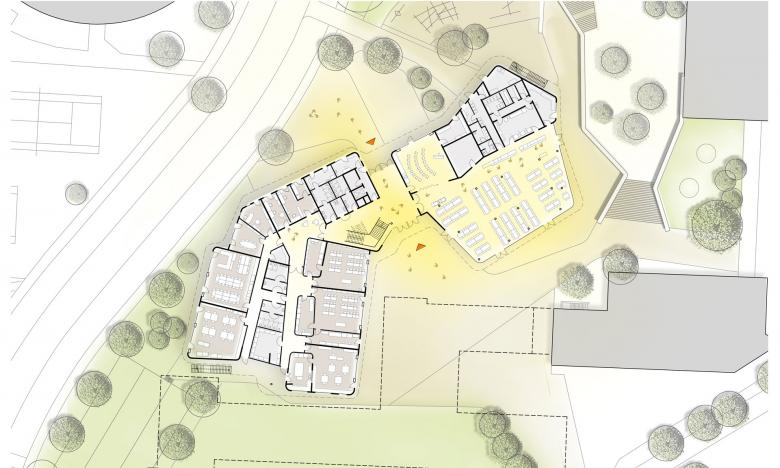 The building centers on the foyer, which acts as a meeting point and provides access to the cafeteria, the student library, classrooms for specific subjects, and rooms for teachers and school social workers. Twin entrance areas create a feeling of permeability, ensuring a clear connection to the space outside. The open atrium is suffused with light and unifies the structure vertically. The garden level opens up onto the Agora with a generous expanse of glazed areas. Different school yards with planted areas, outdoor spaces that merge into one another, and the Agora—a sunken courtyard with steps that just invite you to take a seat—are designed as landscape features that will promote community and enhance the relationship between the two schools.