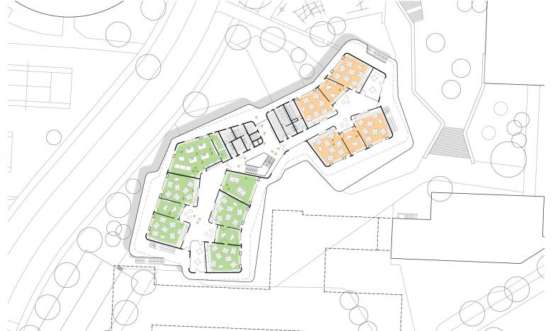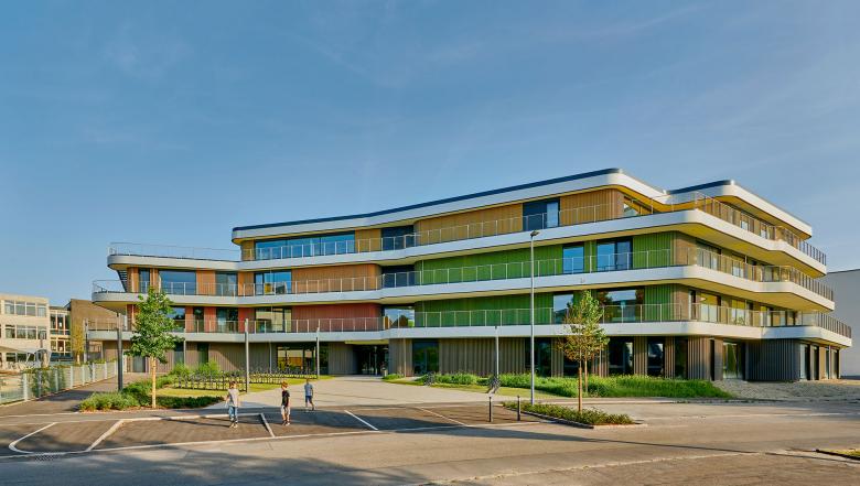 The new school building with its free-flowing, organic design is confidently positioned at the heart of a heterogeneous setting. The horizontal lines and terracing running around each story give the structure a distinct individual character. The architectural concept envisioned the core idea of a vibrant school campus that encourages teachers and students to work together.