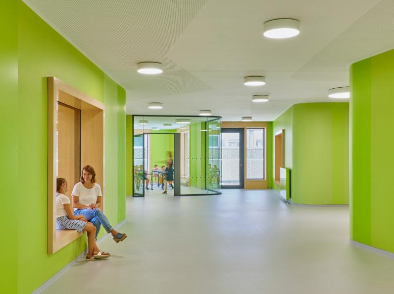 The elementary school is located on two stories in the northwest wing. In the southeast section, the community school occupies three stories for grades five through ten. The available space is organized into a variety of learning landscapes and open room structures that are designed to encourage communication, based on pedagogical theories about learning in an individualized, cooperative, and social manner. Classrooms, group rooms, and multipurpose rooms are combined in units, known as “learning houses.” Teachers can also maximize the sense of openness and transparency by holding classes in the adjoining access zones and in outside areas, which makes the entire building a livelier place. Wraparound terraces provide direct outdoor access. The distinctive color schemes on the walls give the individual learning houses an unmistakable character that helps generate a specific sense of identity. Intense orange, yellow, green, and earthy hues create a vibrant and stimulating mood. Haptic, warm, and high-value materials such as linoleum, wood-based products, and acoustic ceiling materials convey a feeling of well-being.