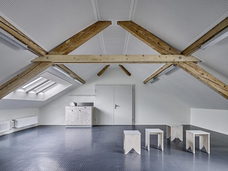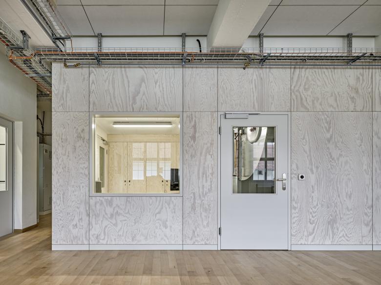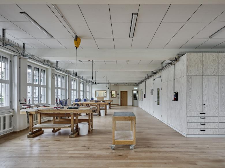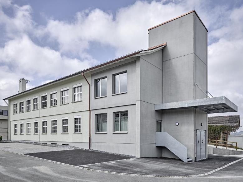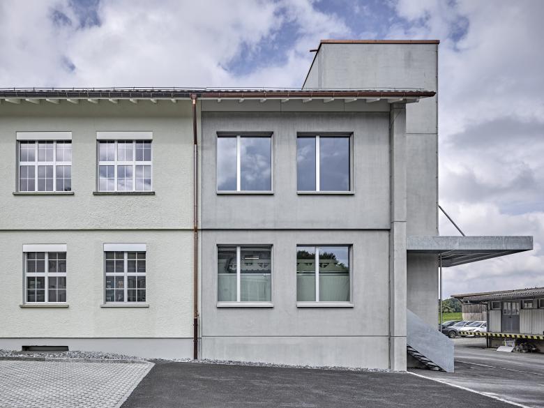 Das dreigeschossige Schreinereigebäude aus dem Jahre 1955 wird unter laufendem Betrieb instandgesetzt und erweitert. Damit den Anforderungen an die betriebliche Sicherheit und an den Bildungsplan für Lernende im Schreinereigewerbe Rechnung getragen werden kann, sind tiefgreifende Baumassnahmen nötig: Die gesamte Haustechnik wird erneuert, Brandschutzmassnahmen werden getroffen, eine neue Späneabsauganlage sowie ein neuer Lift eingebaut und durch Änderungen des Produktionslayouts wird der gesamte Betrieb optimiert. Der Erweiterungsbau ist von den funktionalen und betrieblichen Aspekten der Bauaufgabe bestimmt. Vorfabrizierte Thermowände in Sichtbeton ermöglichen eine kurze Bauzeit und bestimmen den konstruktiven Ausdruck des Anbaus. Der Erweiterungsbau aus roh belassenen Sichtbetonelementen führt das Gebäude in selbstverständlicher Art weiter, setzt sich aber gleichwohl durch Reduktion und Vereinfachung davon ab, so dass der neue Eingriff ablesbar bleibt.
