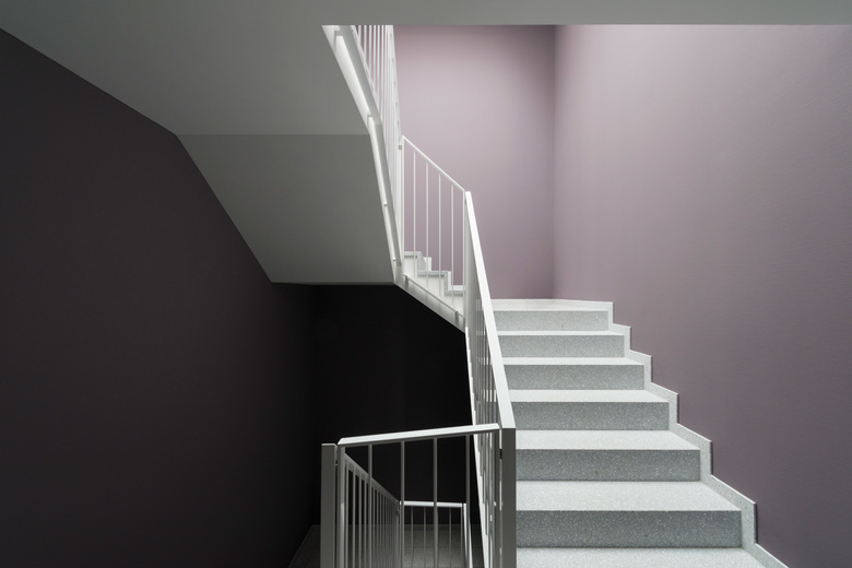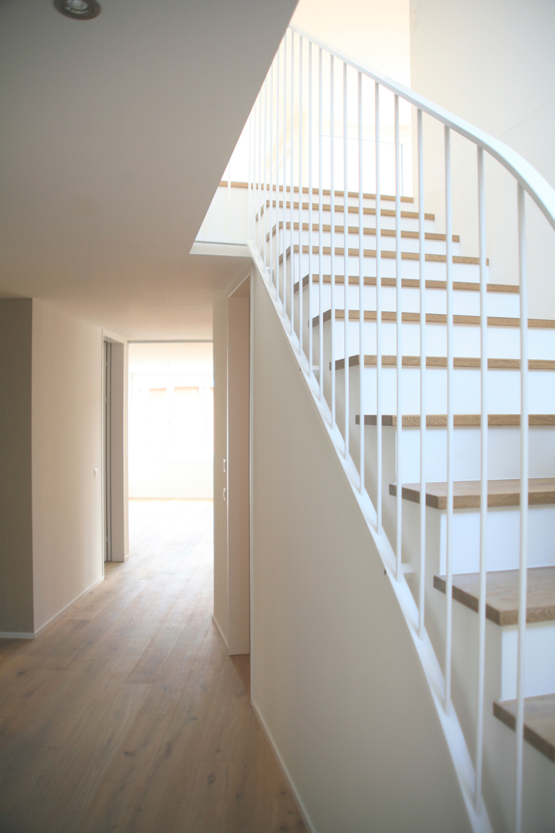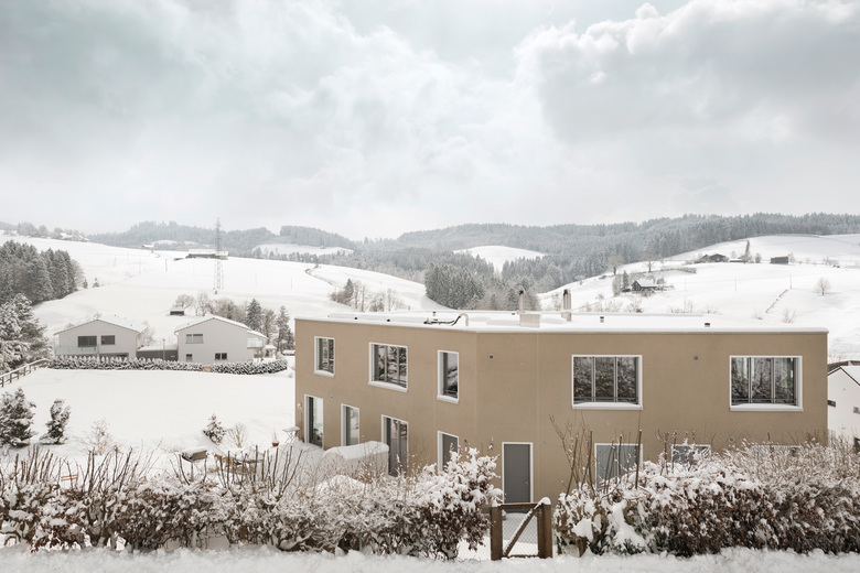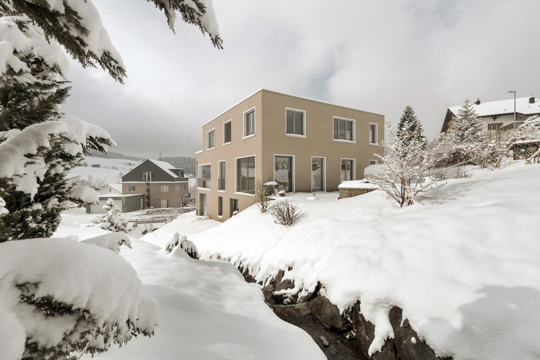 Das Dreifamilienhaus liegt in reizvoller, ländlicher Umgebung am Rande der Stadt St. Gallen. Der fünfeckige Baukörper bildet den nördlichen Abschluss des Neubaugebiets Laderen und gleichzeitig den Übergang zum angrenzenden Naherholungsgebiet. Der vorgegebene Überbauungsplan verlangte unter anderem eine gute Einbettung in den natürlichen Terrainverlauf. Die fünfeckige Gebäudeform passt sich keilförmig in die Ecksituation zwischen den Parzellengrenzen ein, die im Norden von einer Gehölzreihe und im Osten vom Laderenbach gesäumt werden und erzeugt bei hoher Kompaktheit ein Maximum an Privatsphäre für drei Wohnungen. Zwei Maisonette- und eine Attikawohnung bieten ihren Bewohnern grösstmöglichen Komfort und Individualität bezüglich Ausrichtung ihrer Wohn- und Aussenräume wie Loggien, Aussensitzplätze und Attikaterrasse. Der Charakter des Einfamilienhauses wird mit den Vorzügen des Mehrfamilienhauses vermischt und in einem typischen Einfamilienhausquartier ein Ressourcen schonender, haushälterischer Umgang mit Boden und Energie gefunden. Die gemeinsame Nutzung der Infrastruktur bietet allen Wohnungen einen hohen Standard: Grosszügige Gemeinschaftsräume wie Einstellhalle und Veloraum bieten viel Stauraum, der Lift macht alle Wohnungen komplett rollstuhlgängig und die gemeinsame Haustechnik ist umweltschonend und Minergie zertifiziert. Von uns erstellte Variantenstudien und Wirtschaftlichkeitsberechnungen im Vorprojekt unterstützten die Bauherrschaft bei ihrem Entscheidungsprozess. Dadurch, dass die kompletten Architekturleistungen aus einer Hand kommen, können während des Bauprozesses die Kommunikationswege kurz gehalten, die Prozesse optimiert und die Bauqualität in hohen Masse gesichert werden.