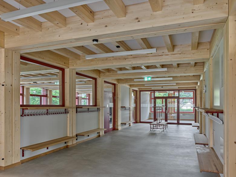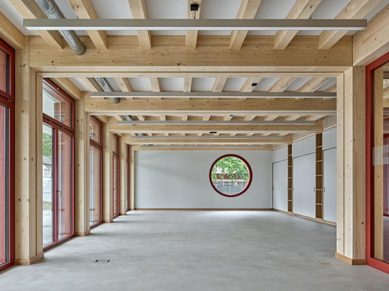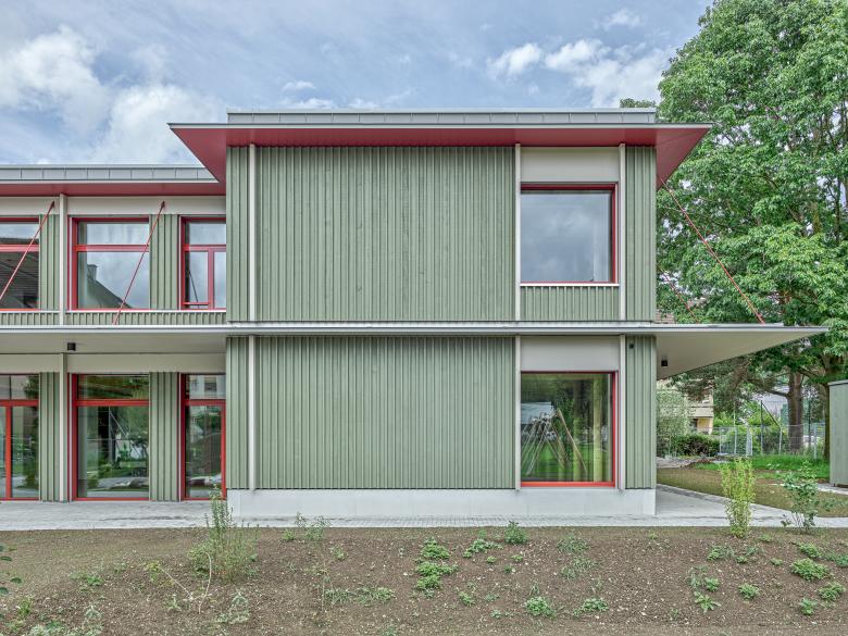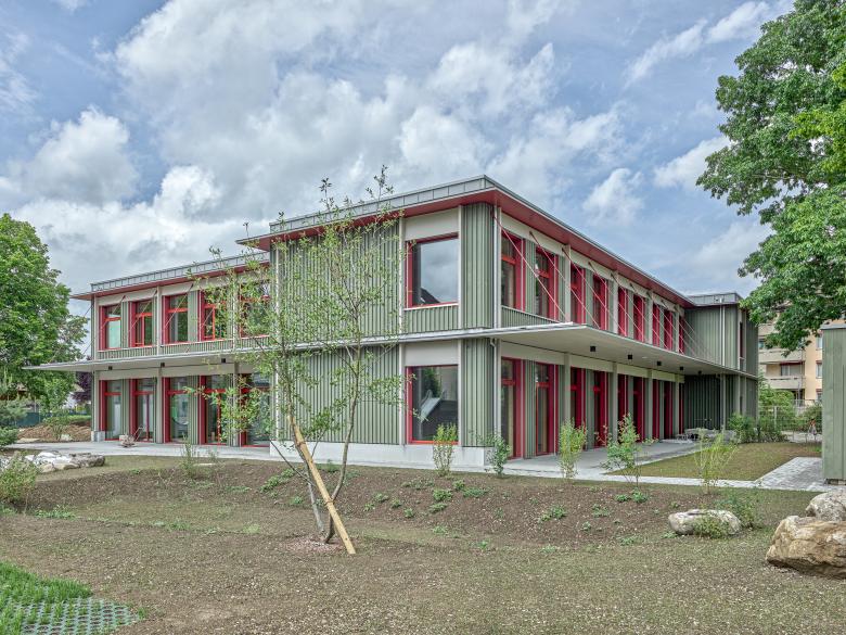 Eine Etappierung mit Aufstockung ermöglicht einen kompakten Baukörper mit geringem Fussabdruck und schafft an der vorgeschlagenen Stelle eine klare Adressbildung. Zusammen mit dem prächtigem Baumbestand entsteht so dauerhaft ein grosser sonniger Freibereich, der spielende und werkende Kinder bereichern wird. Die modulare Bauweise in Holz zeichnet sich durch eine sehr hohe Flexibilität und Wirtschaftlichkeit aus und ermöglicht eine rasche Erweiterung während den Sommerferien. Ein mittig gelegener Raum – frei von jeglicher Vertikalerschliessung - ermöglicht eine willkommenen Schulraumerweiterung, welche auch zukünftigen ambitionierten pädagogischen Konzepten gerecht wird. Die vorgeschlagene Bauweise und Strukturierung des Baukörpers folgt semantischen Bildern eines Atelierbaus, im Sinne eines willkommenen experimentellen Lernlabors für Kinder.