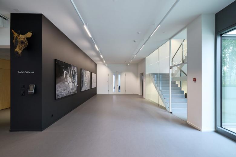 Das Erdgeschoss bietet nun Seminarräume sowie eine grosszügige Cafeteria mit Aussensitzplätzen. Ein Highlight: die inszenierte Kunstsammlung ders Auftraggebers – beleuchtet durch Wallwasher und sichtbar von den Arbeitsplätzen aus.