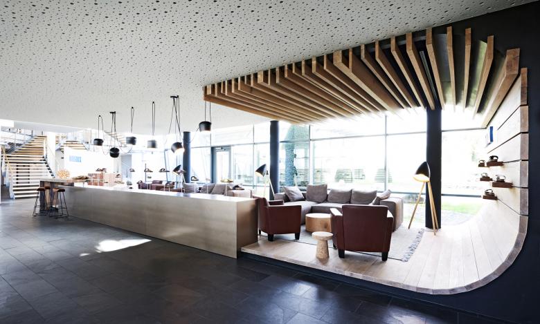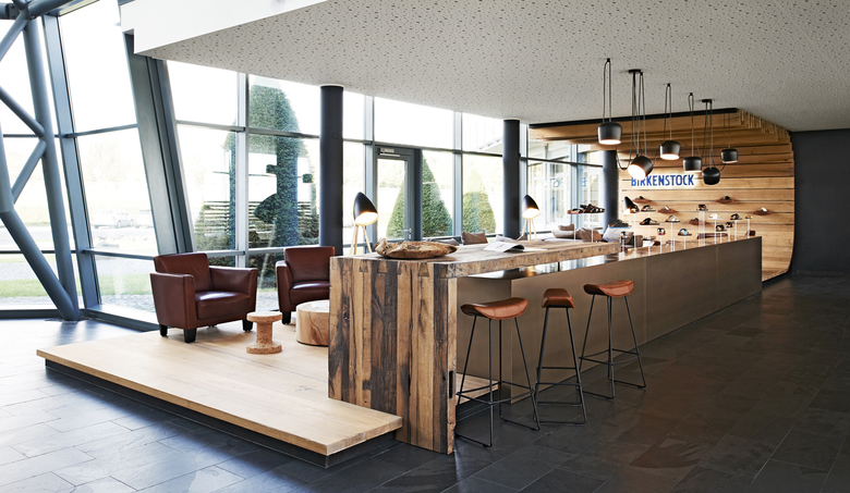 Im zentralen Foyer konzipierte man eine Lounge, die einen exklusiven Raum innerhalb des weitläufigen Entrees bildet. Hier wirkt die ausgesuchte Materialität von Holz, Leder, Kork besonders hochwertig. Das stimmige Arrangement von Sesseln, Sitzmöbeln und Ausstattung schafft eine angenehm wohnliche Stimmung und lädt zum Verweilen ein. Verstärkt wird der Eindruck durch den Dielenboden, der im hinteren Bereich ansteigt, sich zur Decke auf wölbt und den Raum gleich einer Welle einfasst. Integriert in die geschwungene Rückwand sind fein gearbeitete Lederbords, welche die Produkthighlights von Birkenstock präsentieren. Ein langes, aus 100 Jahre alten Hölzern maßgefertigtes Ausstellungsmöbel fungiert zugleich als Präsentationsfläche und als raumbildende Komponente: Auf filigranen Streben schweben hier ausgewählte Birkenstock Modelle; zudem trennt es schlüssig den inneren Bereich der Lounge von der ausladenden Eingangshalle. Der neue Empfang definiert nun den Eingangsbereich, der Mitarbeiter und Gäste begrüßt und eine räumliche Orientierung gibt. Den Empfangstresen realisierten brandherm + krumrey interior architecture als einen schlichten, hellen Holzblock, durch einen diagonal geschwungenen Aufbau aus Dickleder dynamisiert. In grünen Terrarien versenkte Glühlampen kreieren punktuell überraschende Lichtelemente.