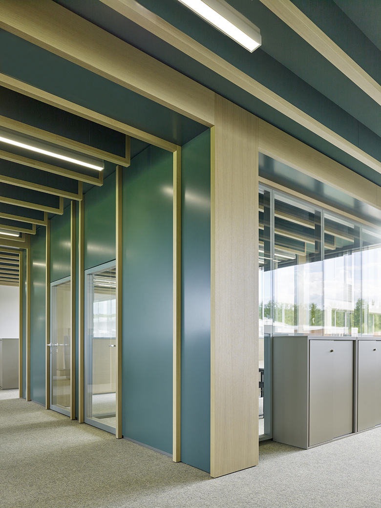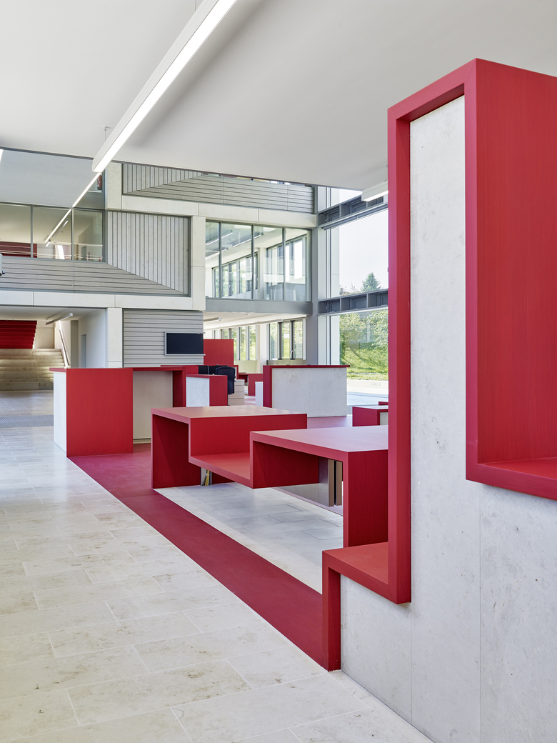 Die Vielfalt der Farbe zeigt sich im Inneren und ist in ihrer Dreidimensionalität auch außen spürbar, leuchtet aus dem Innersten des Gebäudes heraus. Das Foyer formt ein transparentes Portal, erlaubt Einblicke und Durchblicke. Ein Schaufenster zur Produktion. Raum für Kommunikation. Ein multifunktionaler Ort der Begegnung. Eine Farbskulptur heißt willkommen, lädt zum Verweilen oder Besprechen ein. Die Geste der Zukunft zieht sich als handwerklicher, kraftvoller roter Pinselstrich in Form eines Foyermöbels durch den Raum, verbindet alles. Ein Bogenschlag zwischen traditionsreichem Handwerk und innovativer Weltindustrie. Die Farbidee begleitet durch das ganze Gebäude, ist dabei aber nie additiv sondern nimmt sich in ihrer In-tensität zurück, geht eine Symbiose mit der Architektur ein, bietet Orientierung. Jede Abteilung hat ihre eigene Farbe und Identität. Farbwelten. Arbeitswelten. Begleitet von hellem, warmem Eichenholz und Blicken in die umgebende Natur.