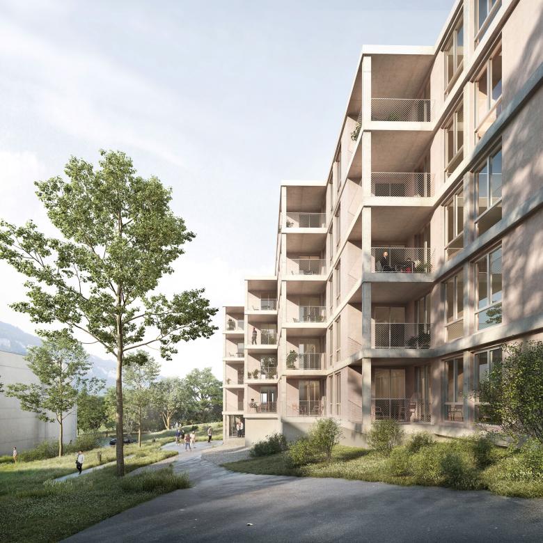 Gestalterischer Ausdruck / Der gestalterische Ausdruck wird durch die beiden unterschiedlichen Seiten des Hauses geprägt. Während der grosszügige Laubenraum durch die horizontale und vertikale Struktur und die membranartige Verglasung einen hohen Grad an Durchlässigkeit zwischen Innen- und Aussenraum erzeugt, bildet die Talseitige Fassade durch die Staffelung und die Auszeichnung jeder Wohneinheit einen kleinteiligen, wohnlichen Charakter. Die horizontalen Betonbänder bilden zusammen mit den vertikalen Pfeilern ein Gerüst, welches durch die verputzten Wandelemente überlagert wird. Mit dieser Reduktion auf zwei mineralische Oberflächen wird der Bau einerseits in die Gesamtanlage mit den horizontal gebänderten und verputzten Gebäude intergiert, andererseits schafft der Neubau einen Bezug zur pädagogischen Hochschule mit der strukturierten Betonfassade und verortet diesen im Quartier.