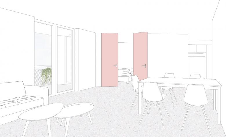 Typologie / Der Neubau interpretiert die Wohntypologie der Wohnhäuser Scalära und Foppa neu. Der Korridor wird aufgeweitet und als geschlossene Laube interpretiert. In Analogie zum nahe gelegenen „Alterswohnhaus zur Linde“ von Peter Zumthor ist dieser Raum ein gemeinschaftlich genutzter Raum mit Blick zur Strasse und zum Aussenraum der Kita und lädt ein zu Gesprächen und geselligem Austausch. Die Küchen werden über diesen lichtdurchfluteten Raum belichtet und partizipieren an diesem. Die Wohneinheiten bilden im Gegensatz dazu einen Rückzugsort mit Aussicht auf die Berge und die Ausrichtung zur Abendsonne.