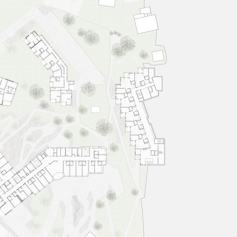 Situation / Das Alterszentrum Kantengut liegt am leicht nach Süden abfallenden Hang, am Rande von Masans. Ein übergeordneter Grünzug bildet das prägende Element des Aussenraumes, welcher die Pflanzgärten der Klinik Waldhaus und das Zentrum bzw. den Vorplatz des Pflegeheims umfasst. Neben der kleinteiligen Bebauung entlang der Cadonaustrasse bildet die streng geometrisierte „Pädagogische Hochschule“ im Westen die Nachbarschaft des Alterszentrums. Das Geviert selbst ist geprägt durch mehrere Einzelbauten, eingebettet in eine parkartige Anlage. Das funktionale und volumetrische Zentrum bildet dabei das Pflegeheim, um welches sich die kleineren Wohnbauten satelitenartig gruppieren.