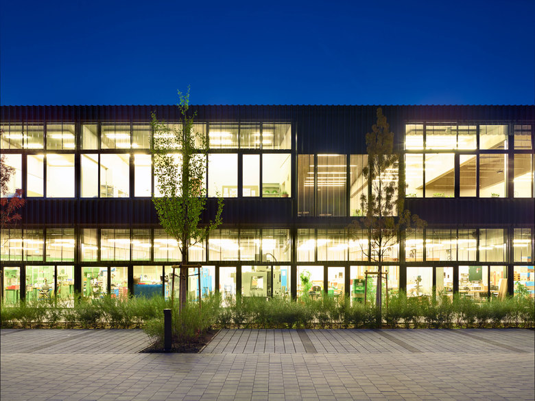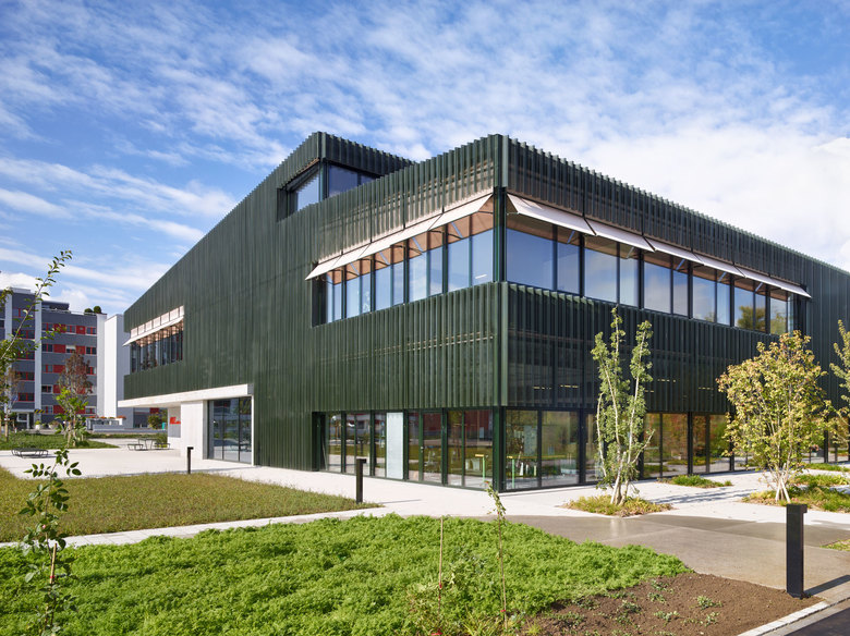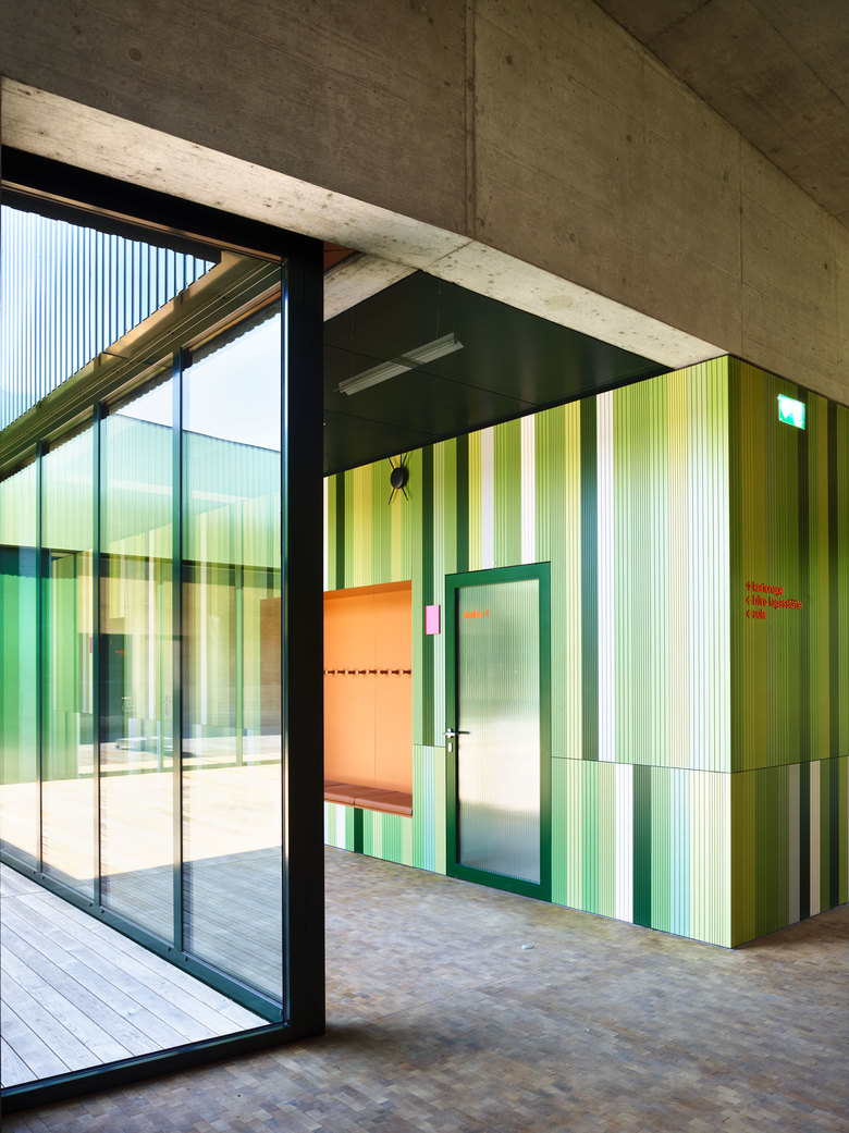 Der innere Aufbau der drei Zonen ist auch im Ausdruck nach Aussen ablesbar; Schrägdächer zeichnen die Struktur spielerisch nach, teilweise als schüzender Giebel, teilweise als aufgeklappter Shed oder als bewegte Dachlandschaft. Diese Verschiedenartigkeit der Dächer schafft auf jede Seite hin einen spezifischen Ausdruck und eine einprägsame Zeichenhaftigkeit.
