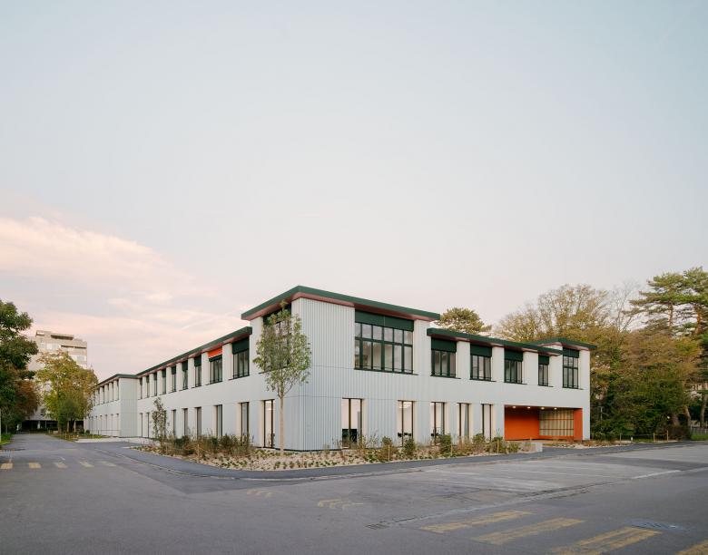 Um die Eigenständigkeit des Neubaus innerhalb des Areals zu stärken, wird das Wohn- und Therapiegebäude der Kinder- und Jugendpsychiatrie an der Westecke des Grundstücks platziert im Gegenzug dazu das Schulhaus an den Ostrand des Perimeters geschoben.