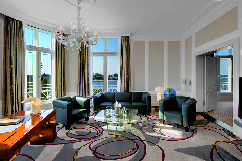 Die Gestaltung nimmt Bezug auf die über 100jährige Geschichte des Hauses als Grandhotel für Passagiere der Transatlantik-Luxusliner und Hamburg als Tor zur Welt. Unterschiedliche Dekorwelten prägen die einzelnen Etagen. Die 1. Etage ist inspiriert von Afrika mit erdigen Tönen und Farben der Wüste, in der 2. Etage erinnern blaue Farbtöne und glänzende Silberornamente auf Brokat an die Belle Epoque Europas. Kräftige Violett-Töne und großflächige geometrische Muster verweisen in der 3. Etage auf das Art Déco der 1930er Jahre Amerikas. In der 4. Etage dominieren als Hommage an Asien Rot-Gold-Töne und Seidenstoffe. In der Atlantic-Suite mit über 100 m² kommt der moderne Luxus dieses Grandhotels mit handgefertigten, extra weichen Teppichböden, Vorhängen aus Rubelli-Seide und anderen hochwertigen Materialien in Kombination mit moderner Kunst und Designermöbeln zur vollen Geltung.