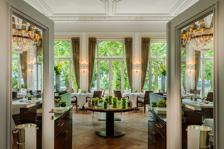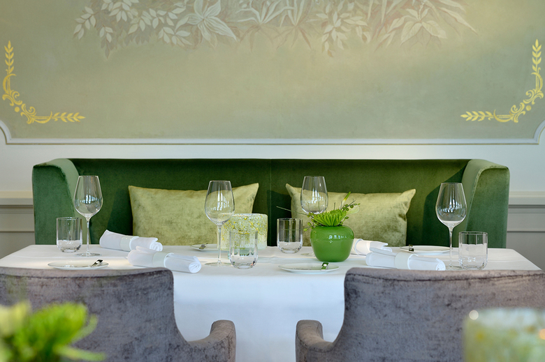 Nun präsentieren sich die Bar, die Wohnhalle und das Restaurant ihren anspruchsvollen Gästen in neuem und dennoch vertrautem Gewand: In allen Bereichen wurde Vorhandenes mit feinsinnig aufeinander abgestimmten Farbtönen und eleganten, komfortablen Möbeln zu einem zeitgemäß-zeitlosen Ganzen vereint. Neue Möbel wie auch eine Auswahl von vorhandenen Möbeln wurden mit ausgesucht hochwertigen Stoffen bezogen. Dabei brillieren auch mal Sofas in Flaschengrün oder Lavendel.