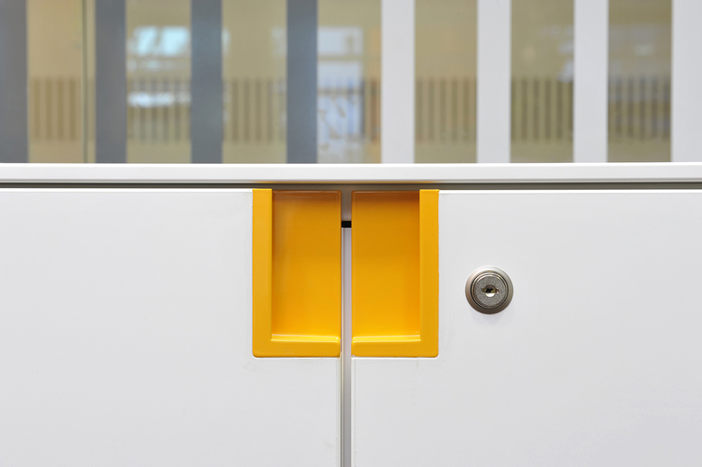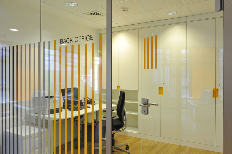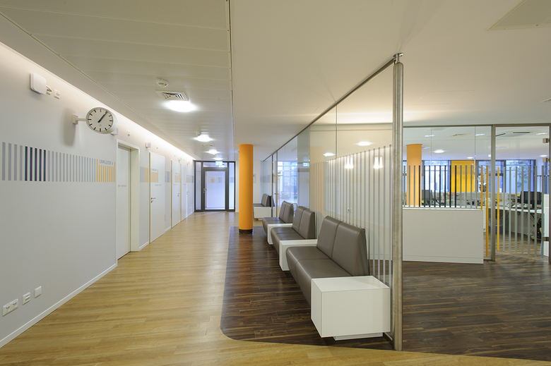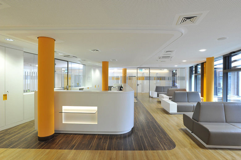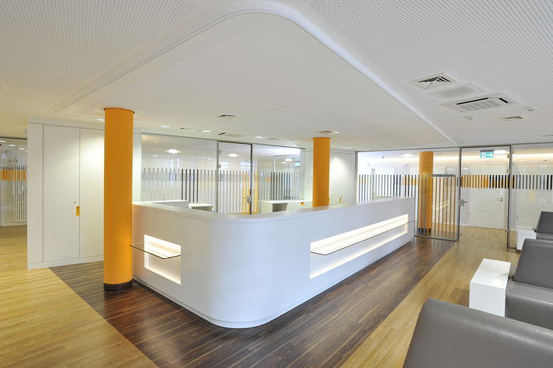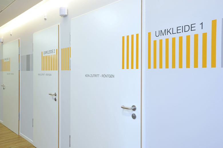 Der Entwurf hat zwei Hauptmotive – zum einen finden sich die vertikale Streifengrafik des Gemeinschaftspraxis-Logos an den (Glas-) Wänden als Sichtschutz und zur Einbettung des Leitsystems (Raumbeschilderung) wieder. Die Farben des Praxis-Logos – orange und grau – setzen die Akzente im Raum. Zum anderen zonieren Tresen und Schrankrückwandelement auf weiße Körper reduziert den großzügigen und hellen Empfangsbereich zur klaren Wegführung für die Patienten.