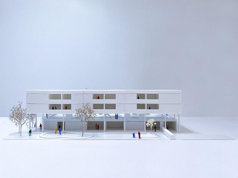 Durch die differenzierte Abstufung/Abfolge der Baukörper wird eine baulich/räumliche Trennung der Kindertagesstätten-Außenfläche zu den Wohnungen erzeugt, was zur Optimierung der gegenseitigen Verträglichkeit zwischen den unterschiedlichen Bereichen beiträgt (Kindertagesstätte und Wohnnutzung). Gleichzeitig wird durch die Fuge zwischen dem Dachgarten und dem südlichen Wohnriegel eine bessere Belichtung und Aussicht für den nördlichen Wohnriegel erreicht. Darüber hinaus wird das Erdgeschoss als eingeschossiger Baukörper wahrgenommen, die Kindertagesstätten-Nutzung wird nach außen hin ablesbar, und der Luftraum über der Terrasse öffnet sich nach Norden zum Dachgarten hin.