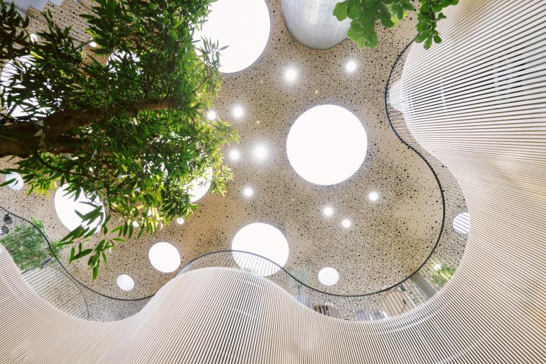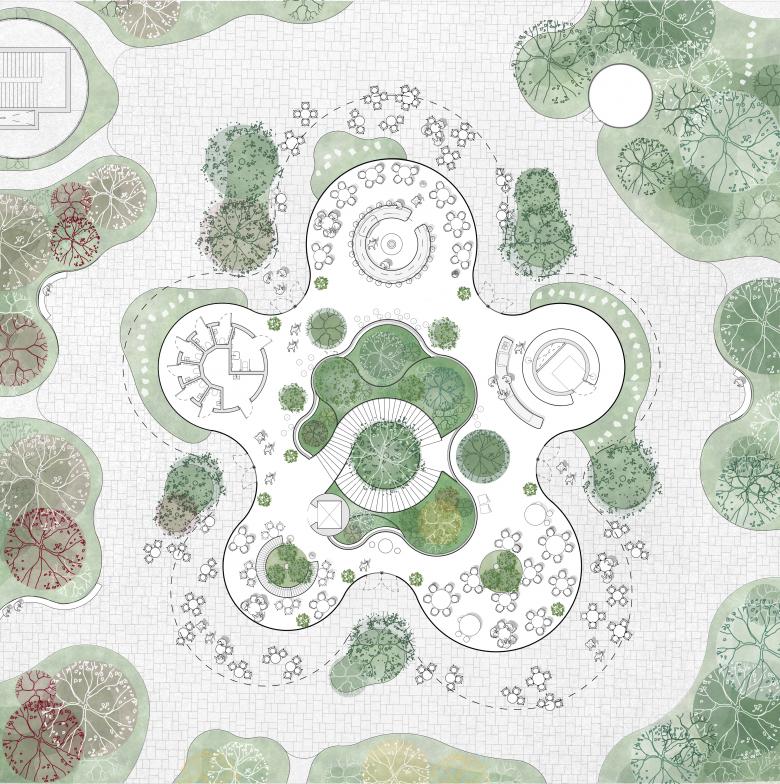 The park, with the size of three soccer fields, consists of six gardens from various parts of the world: the North American Forest, the Danish Oak Forest, the Nordic Forest, the Oriental Garden, the English Garden, and the Subtropical Garden housed within a greenhouse and atrium at its center. The diverse gardens hold surprises such as a fountain, a water lily pond, and a reflecting pool where drops of water from a mast gently strike the water’s surface in a soothing rhythm. Meandering paths and organically shaped flowerbeds knit together the park’s elements.