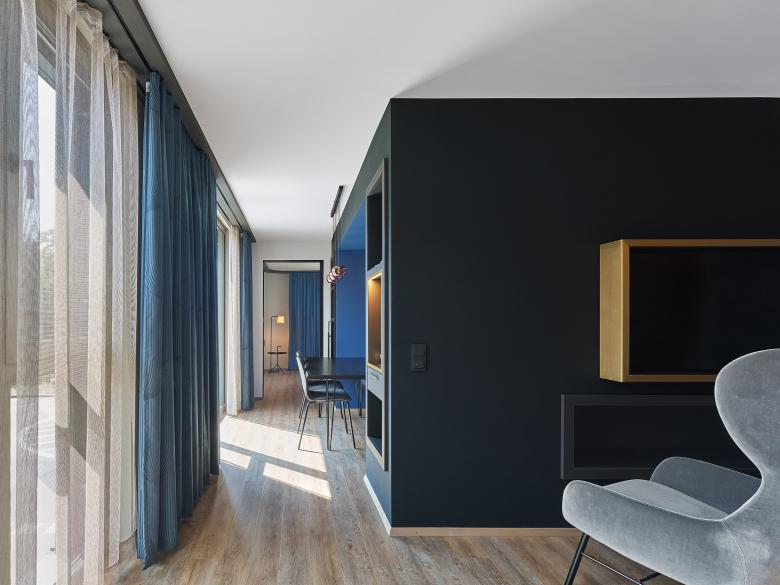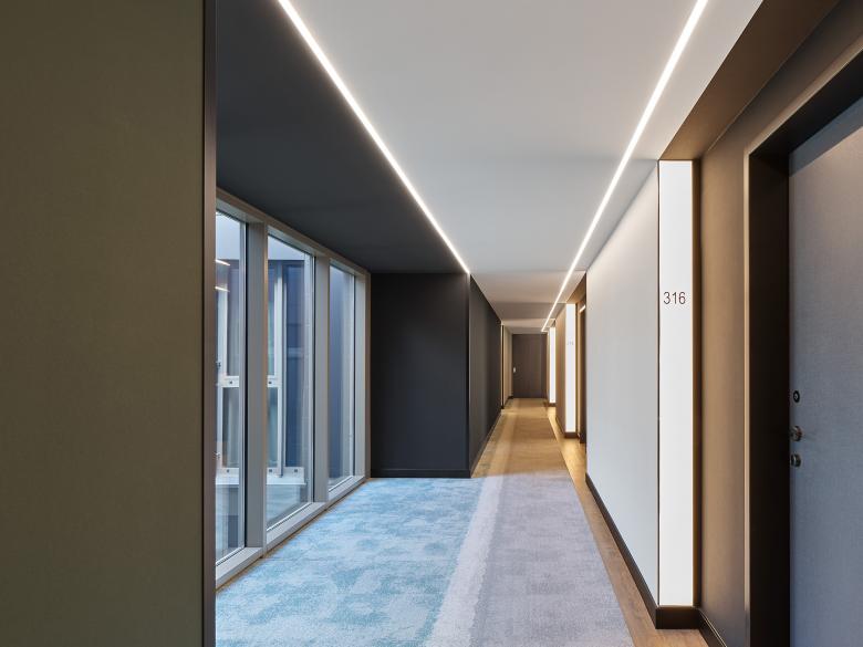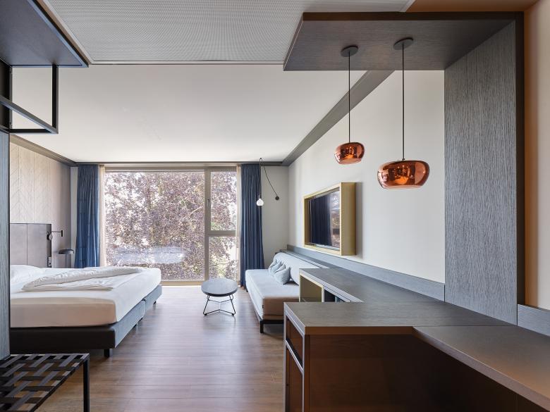 Mit Materialien mit schmeichelnder Haptik, griff das Innenarchitektur-Team das Thema der Gastfreundschaft auf und übersetzte dies außerdem mit dekorativen Details. Über der Empfangstheke begrüßt der Schriftzug „Wo Gäste Freunde sind“ die Ankömmlinge. Über die Lobby gelangen die Gäste entweder zu den insgesamt 86 Zimmern oder in das, in der Verlängerung leicht abgestufte Restaurant.