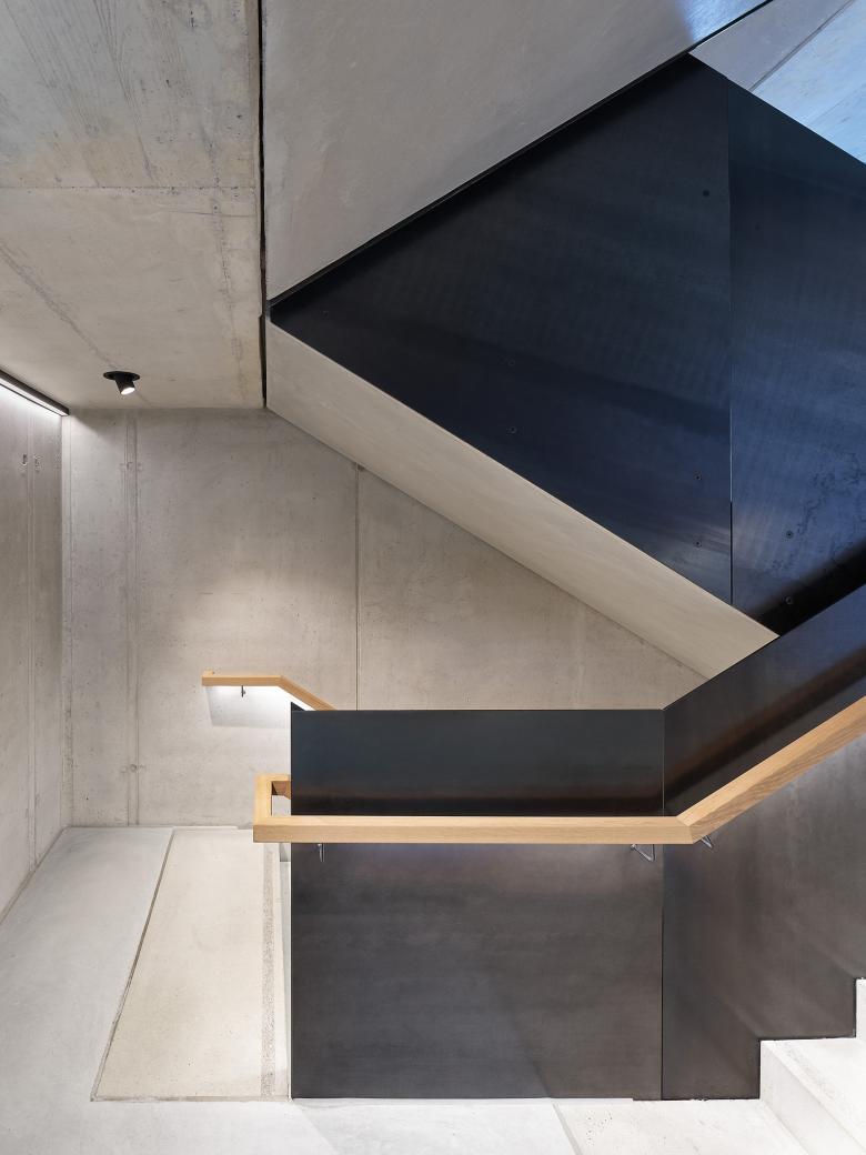 Eine hochwertige dunkle Aluminiumfassade mit großen Fensterformaten formt den Hauptbaukörper. Das Erdgeschoss ist zurückgezogen und formuliert so den Zugang zum Gebäude, gleichzeitig lässt es den Hauptbaukörper schweben. Auf dem Dachgeschoss wurde eine Skybar mit grosszügiger Dachterrasse platziert.