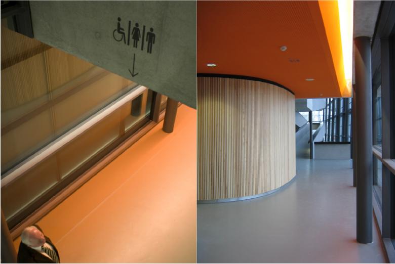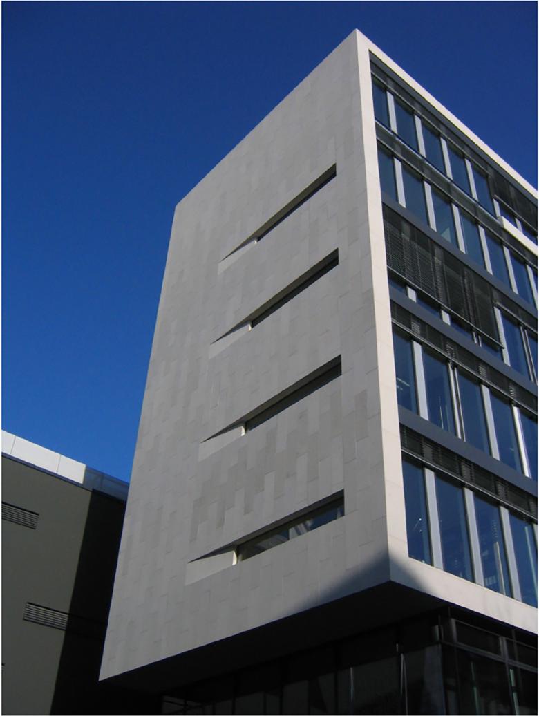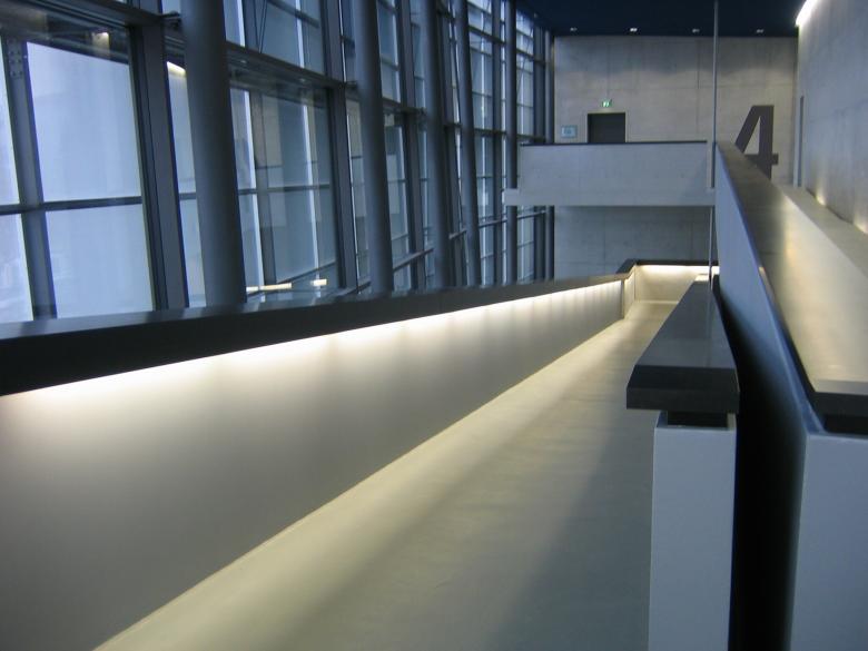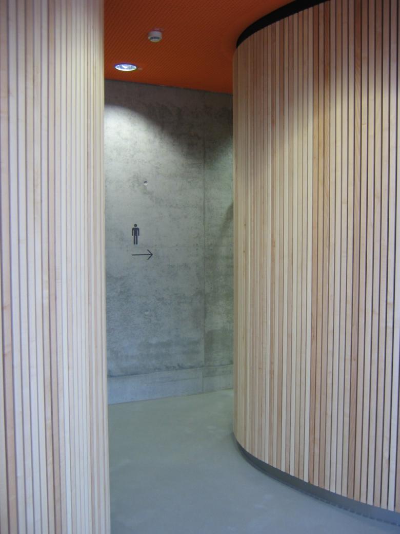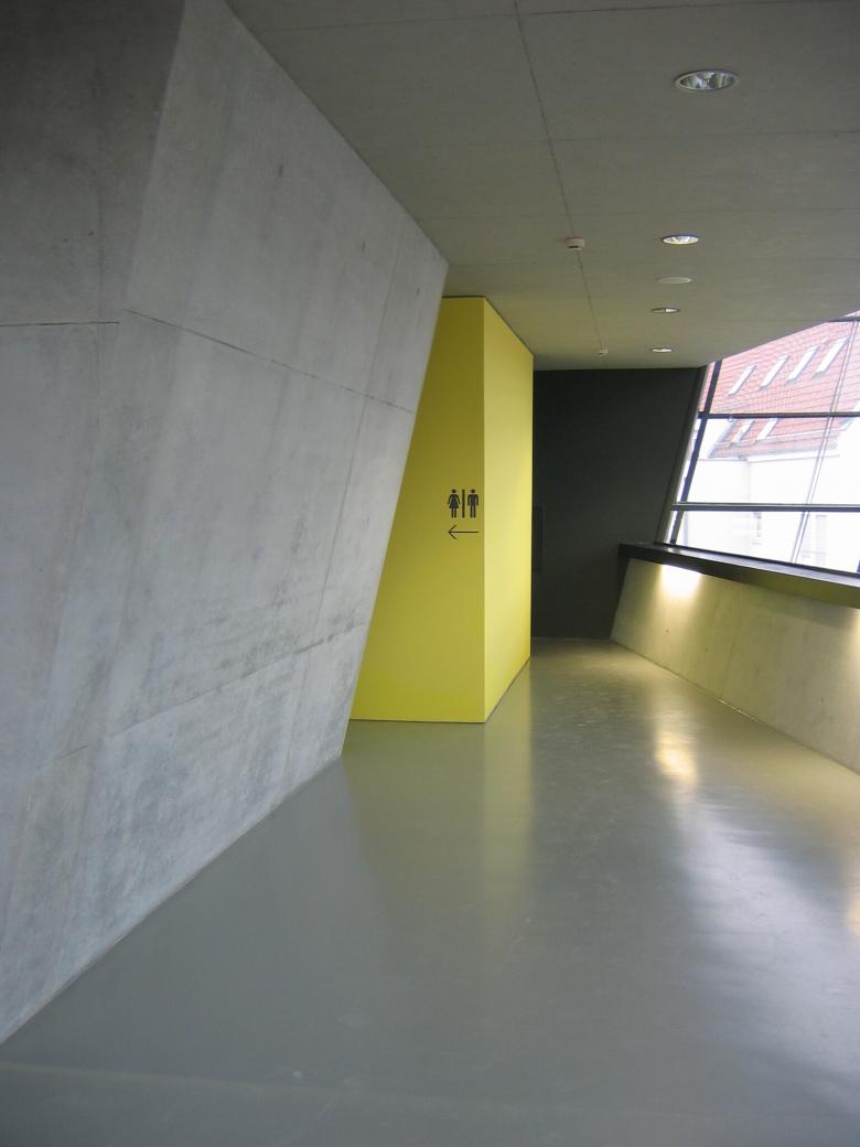 Die Fassade wurde mit Streckmetallelementen überzogen um der Fassade eine Tag- und eine Nachterscheinung zu geben. Der Baukörper wirkt tagsüber monolithisch scharf kantig geschnitten, nachts von innen erleuchtet kehrt sich das Innere nach aussen und die wandelnden Besucher werden selbst zur Kulisse.