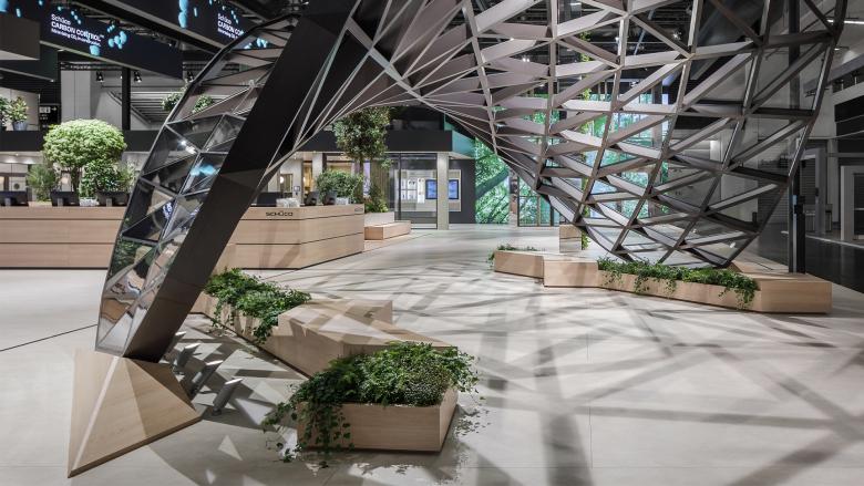 Das grüne Zentrum ist Treffpunkt für Dialog, Begegnung und Hospitality. Als raumgreifende mediale Bespielung wird dazu die CARBON CONTROL Kampagne atmosphärisch kommuniziert.