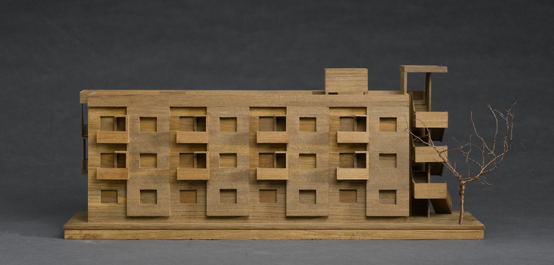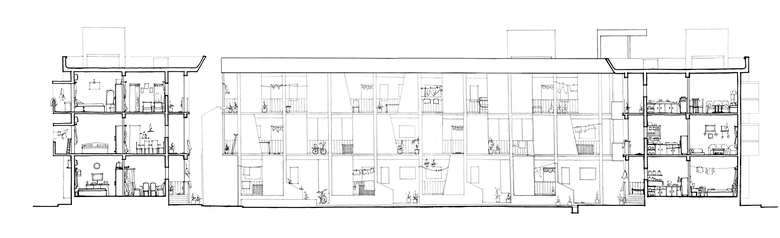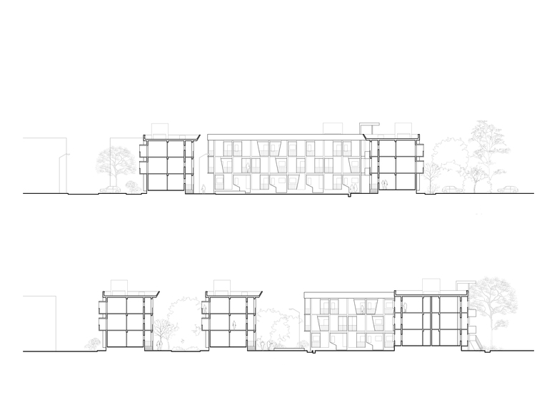 The form of each staircase is carefully articulated to give each block a little twist and hereby giving each an identity of its own. The construction system is a very simple brick and concrete system using locally available artisans. The structural system is carefully calibrated to produce a facade which helps to scale the building to a more humane level.