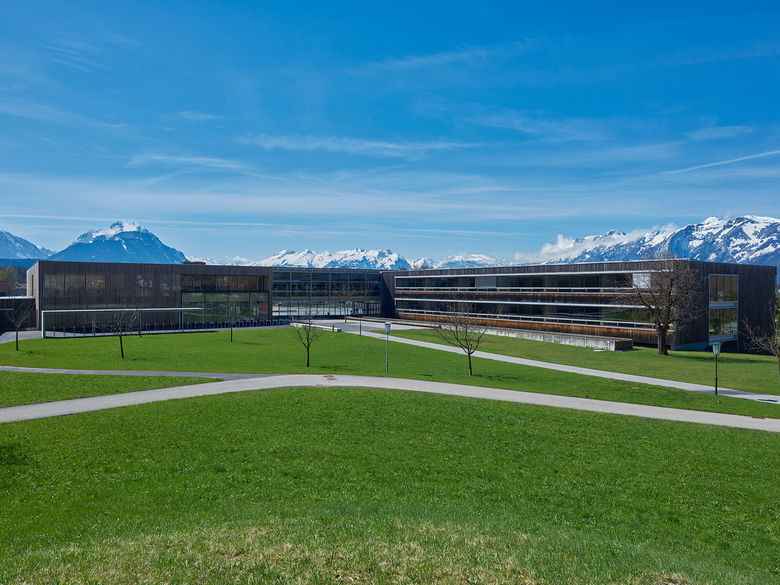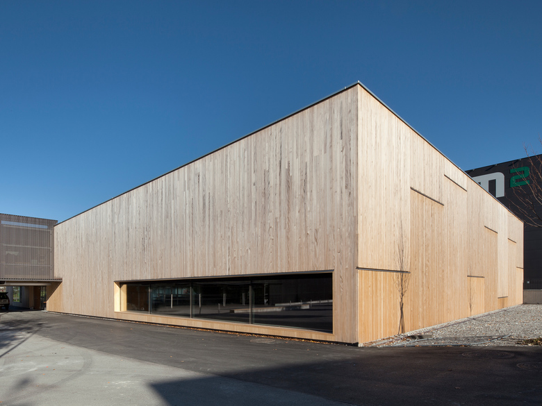 Die Schule liegt direkt an der Landesstraße zwischen dem Ortseingang von Klaus und dem angrenzenden Industriegebiet. An diesem exponierten Platz braucht es eine kräftige und klare Baustruktur, die eine Adresse bildet und einen markanten Anker setzt. Das L-förmige Schulgebäude ist leicht von der Straße abgerückt und definiert mit seiner breiten Südfassade den Vorplatz. Dem Verlauf der Straße folgend, ist die Halle parallel zur Schule nach vorne versetzt. Ein zweigeschossiger verglaster Querriegel verbindet die Schule mit der Halle und schafft einen vom Verkehr geschützten Platz, von dem aus man alle Funktionen erreicht.